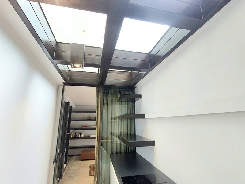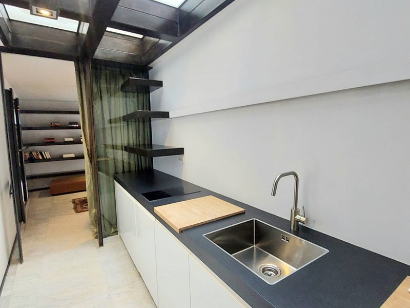 Dallingresso si accede, tramite un comodo spazio longitudinale sapientemente sfruttato con una parete attrezzata uso cucina di design, ad un'unica zona living, molto particolare, di grande fascino con affaccio su una chiostrina privata.