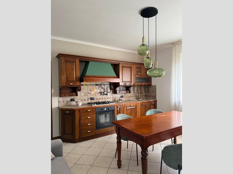 • Cucina in legno massello completamente attrezzata: piano cottura a gas, forno, lavastoviglie, frigorifero con congelatore, cappa decorativa