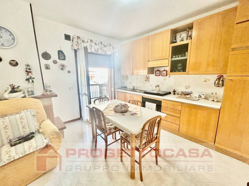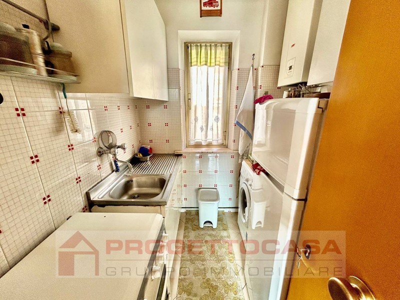 A destra, la cucina abitabile con camino ti accoglie con il suo balcone spazioso. Di fronte, il bagno finestrato con box doccia serve la zona giorno in modo pratico e funzionale.