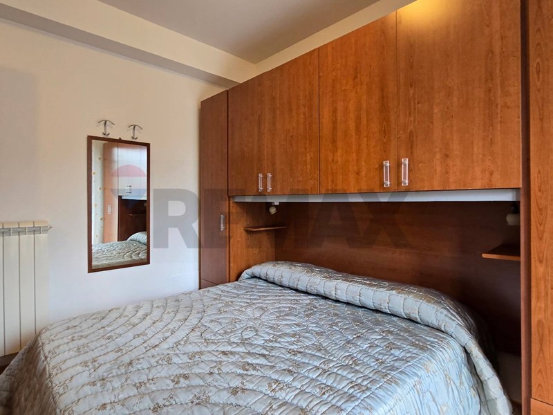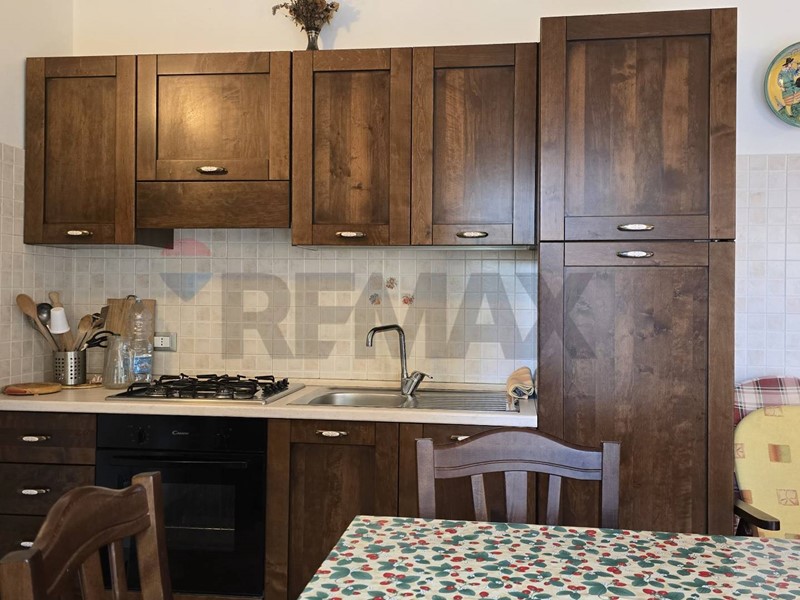 L'immobile viene venduto arredato, con una cucina a vista che si affaccia sul soggiorno, creando un ambiente moderno e luminoso.