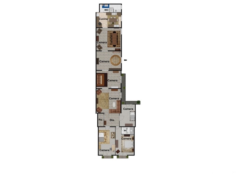 La distribuzione interna è classica e ben leggibile, con una chiara separazione tra zona di rappresentanza, ambienti di servizio e zona notte.