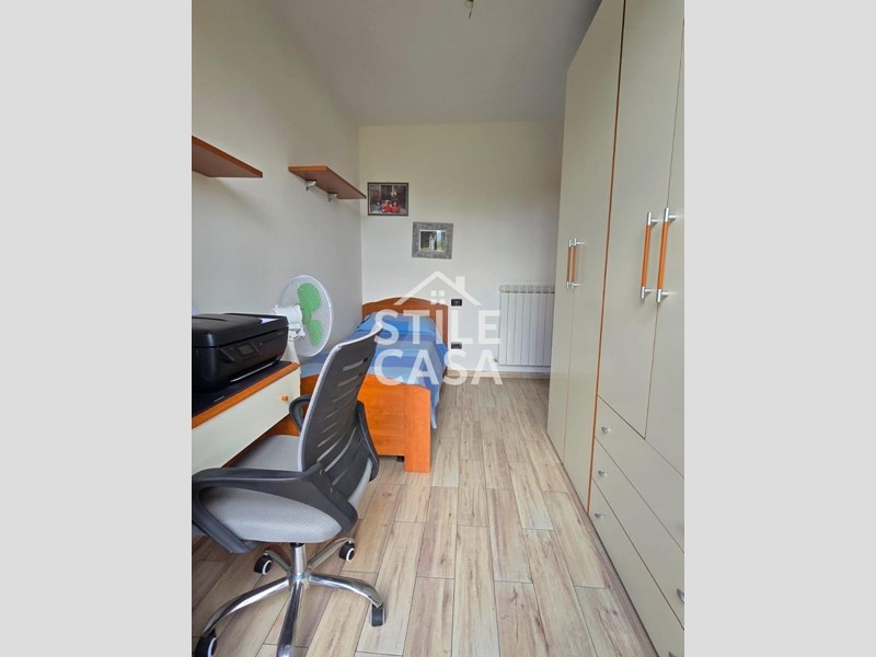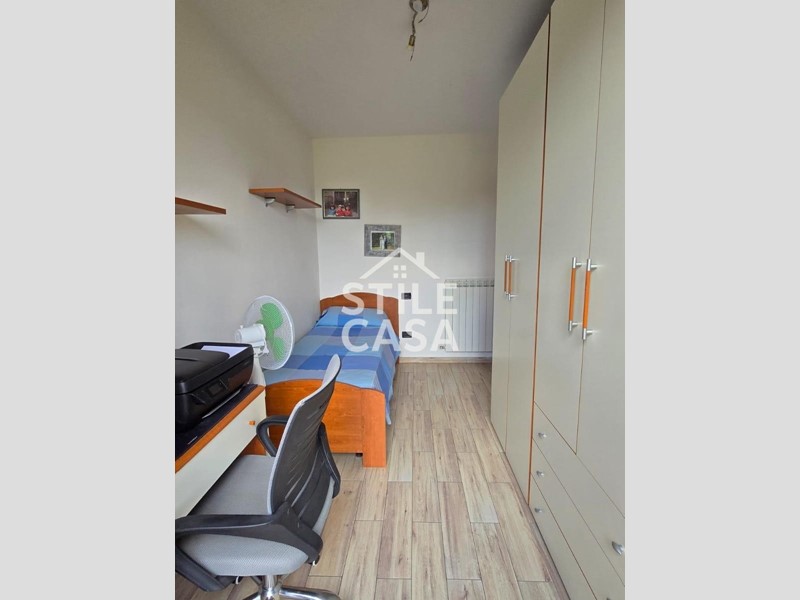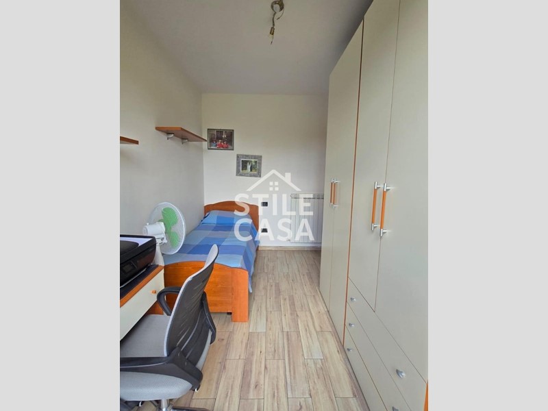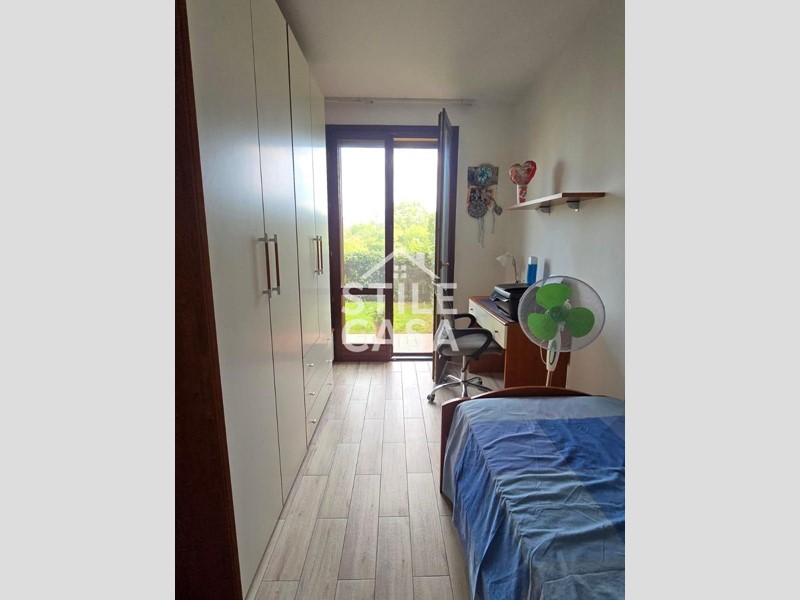 La porta blindata si apre su ingresso, ampia zona giorno con soggiorno e cucina a vista, ripostiglio, disimpegno, camera matrimoniale, cameretta e bagno completo con doccia finestrato.