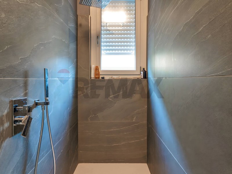 Finiture d'Eccellenza: Pavimenti in grès a listoni (120 cm), camera in parquet, doccia walk-in in resina e sanitari sospesi.