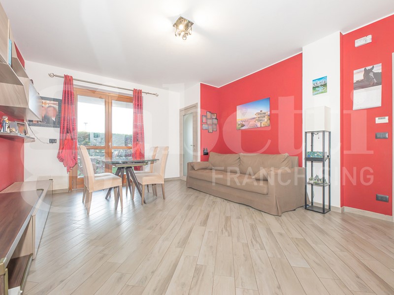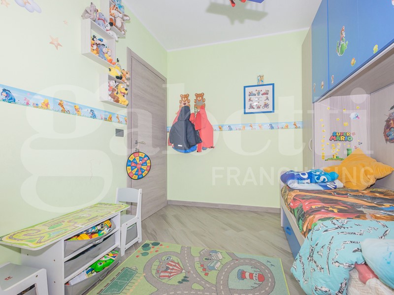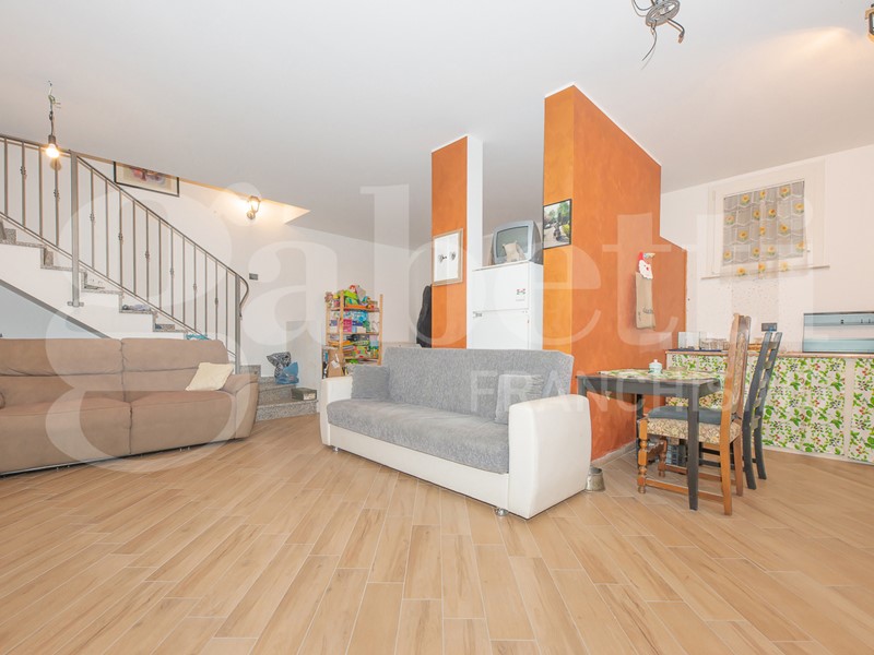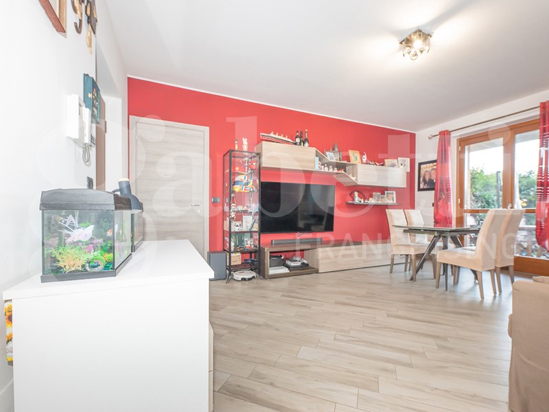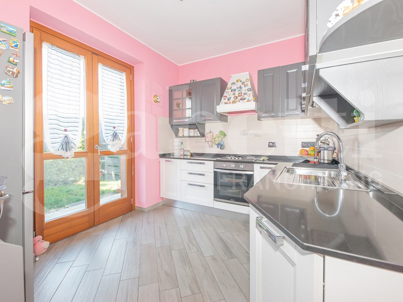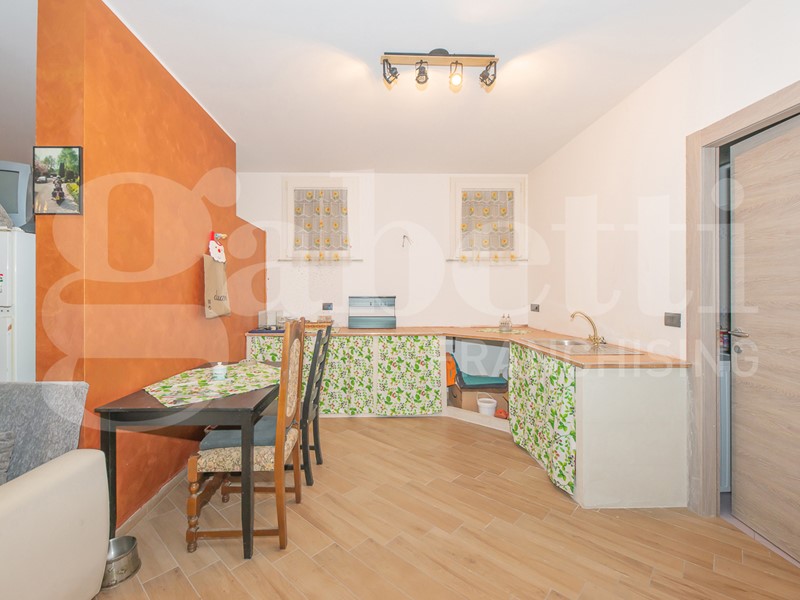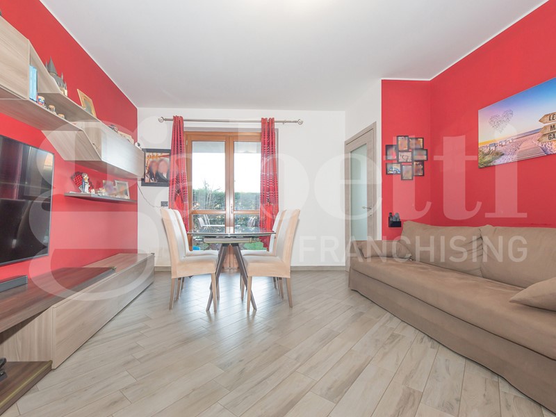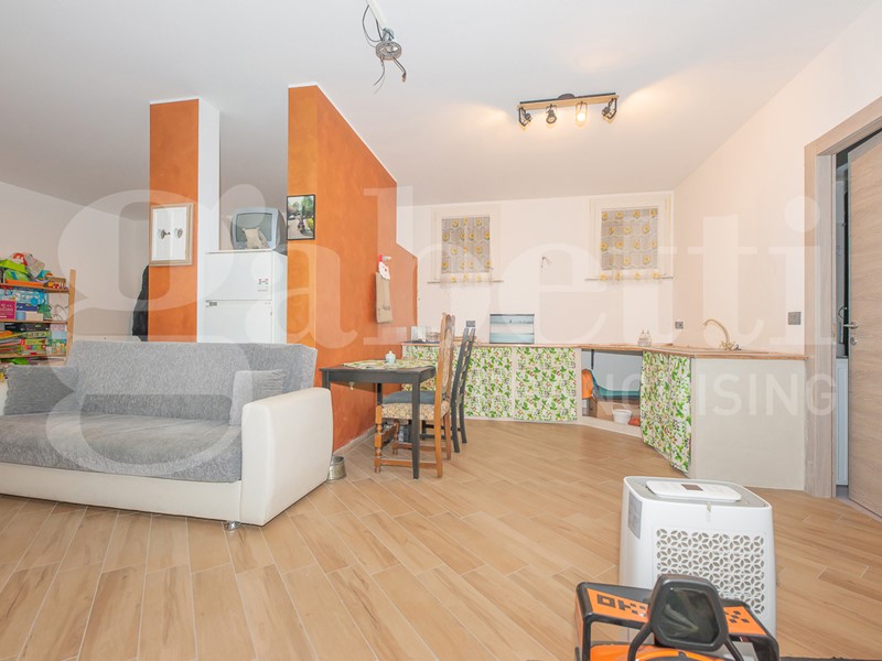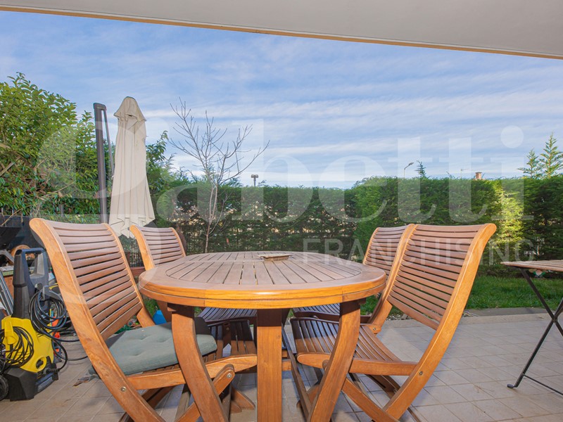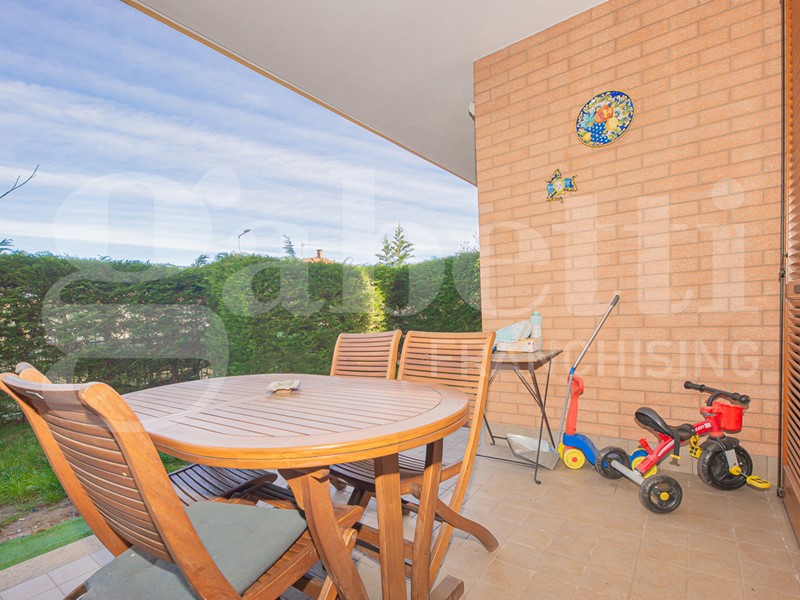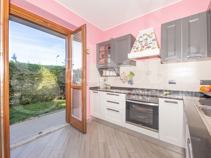 L'alloggio è posto al piano terra ed è composto da ingresso su soggiorno con accesso al terrazzo e al giardino, cucina abitabile con accesso diretto al giardino, disimpegno, due camere e bagno.