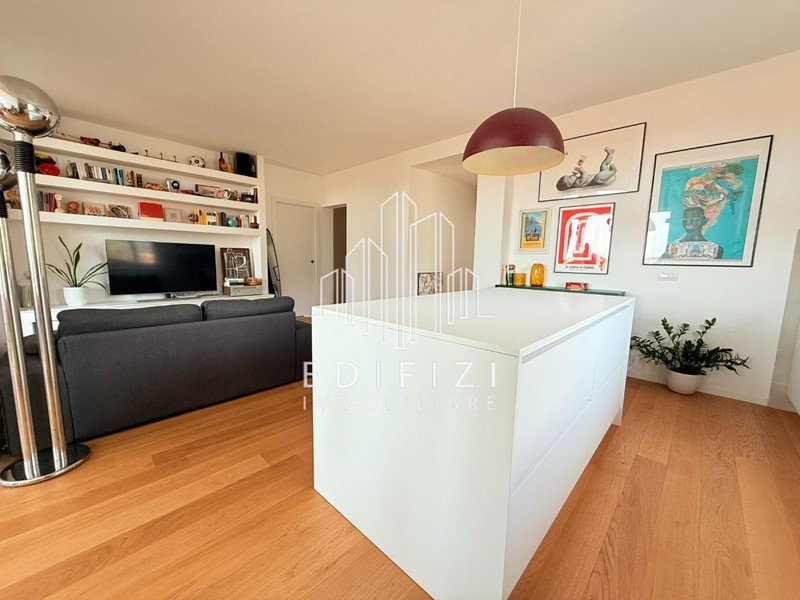 Ingresso con disimpegno, grande open space con cucina a vista e comodo soggiorno, zona pranzo dotata di grande vetrata con vista panoramica e splendido balcone compongono la zona giorno che è completata dal bagno di servizio completo.