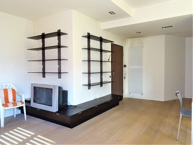Il parquet riveste quasi lintera superficie, mentre le porte in alluminio e vetro, in camera e bagno, conferiscono unimpronta contemporanea agli ambienti.