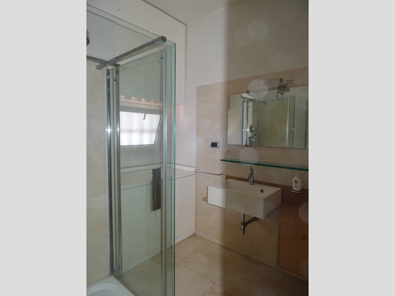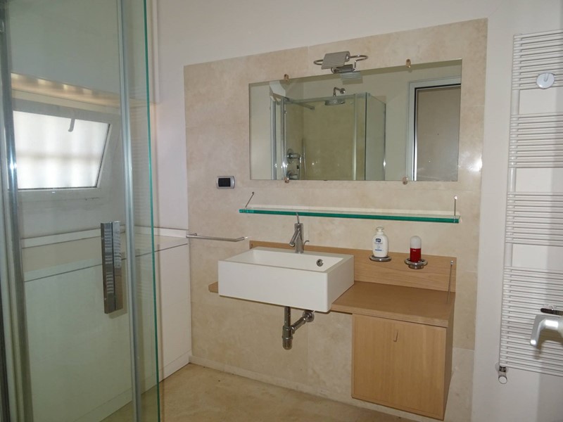 Il bagno è moderno, con doccia e sanitari sospesi.