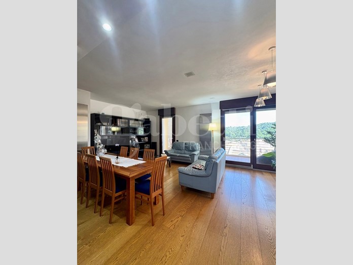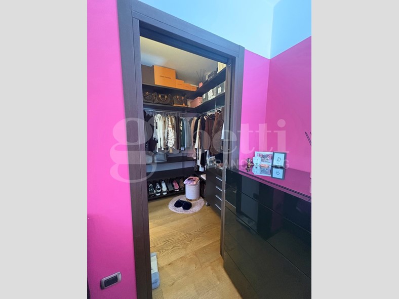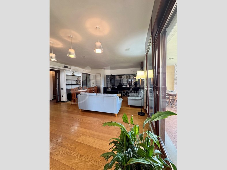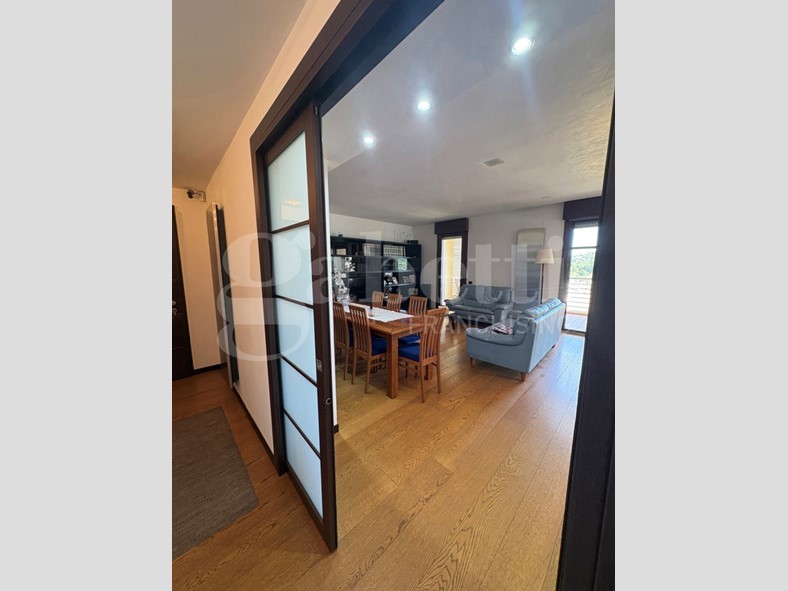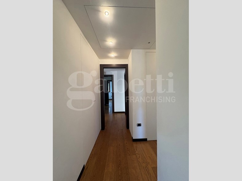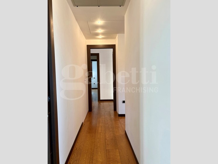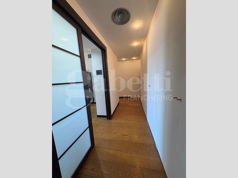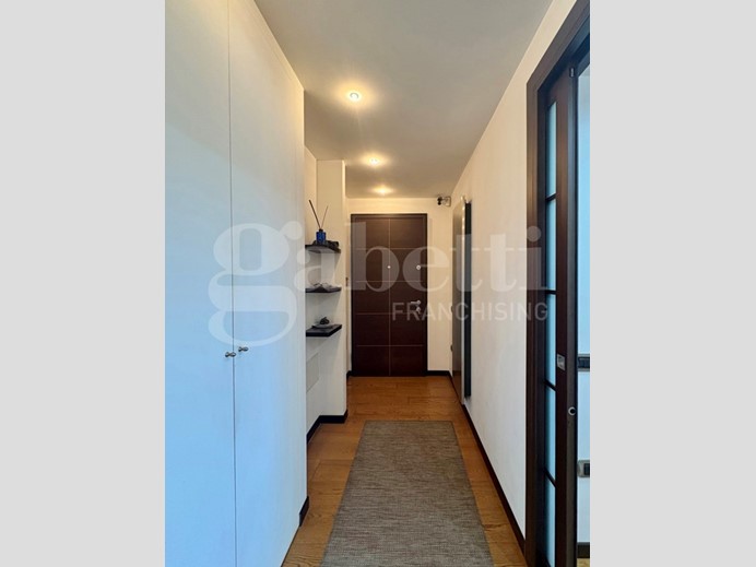 L'appartamento, con pavimentazione in parquet di rovere, si apre su un ampio ingresso, dal quale, tramite grande porta a scrigno, si accede alla zona giorno.