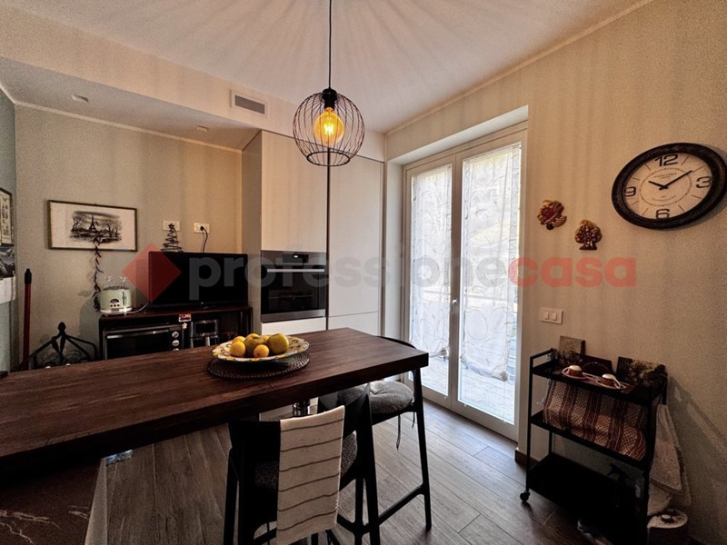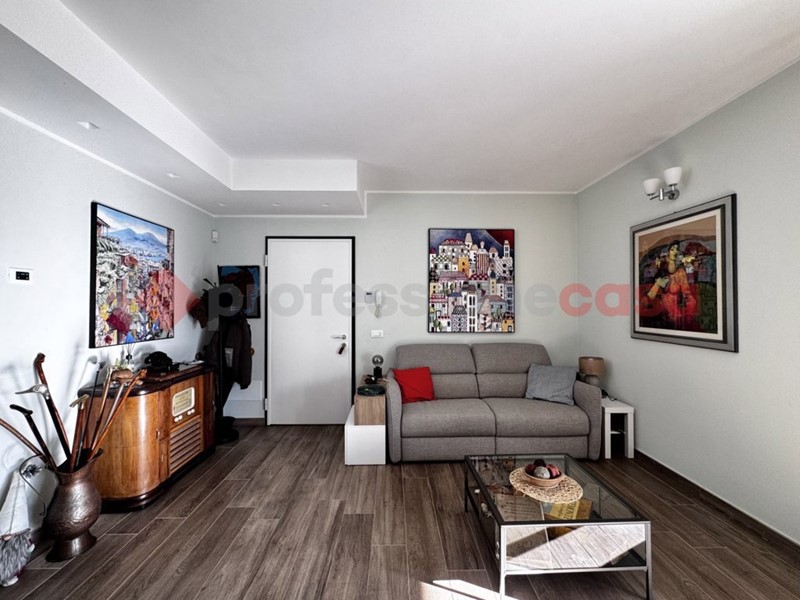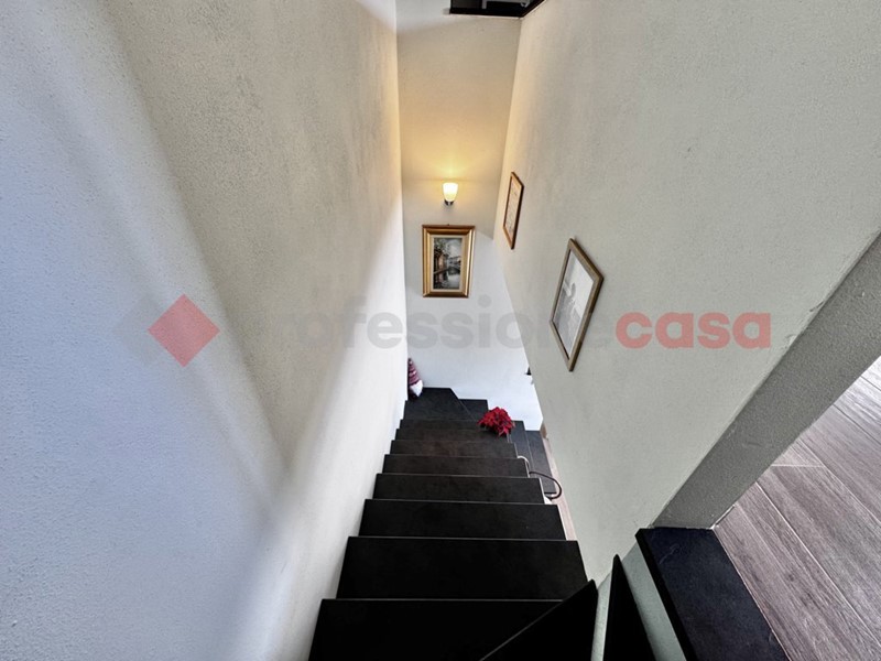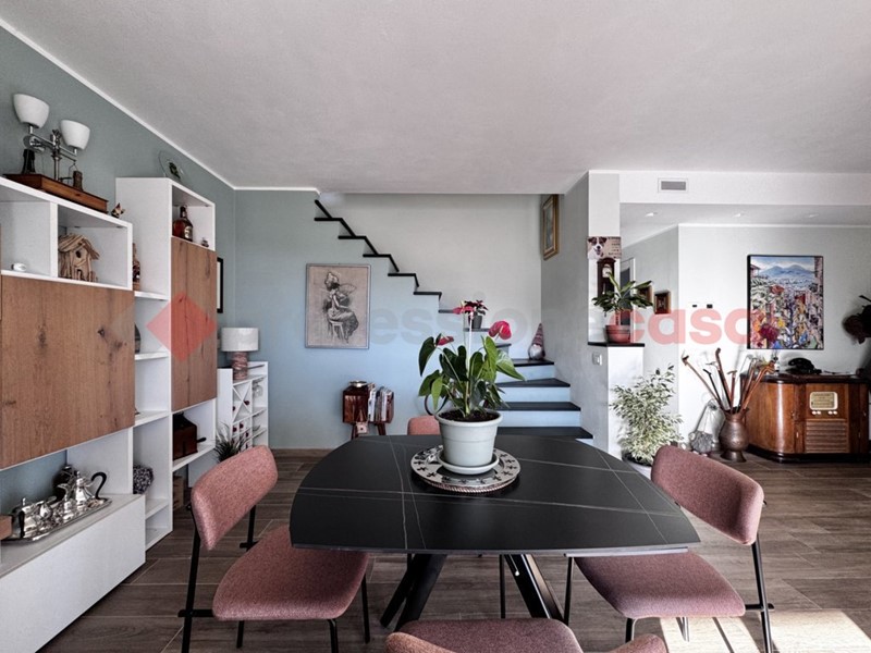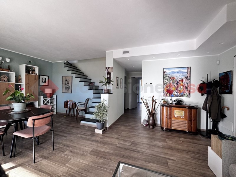 L'abitazione accoglie con un ampio e luminosissimo soggiorno, vero cuore della casa, impreziosito da una raffinata scala in ardesia che collega armoniosamente i due livelli. Dal soggiorno si accede a un grande terrazzo vivibile, perfetto per pranzi e cene all'aperto nella bella stagione.