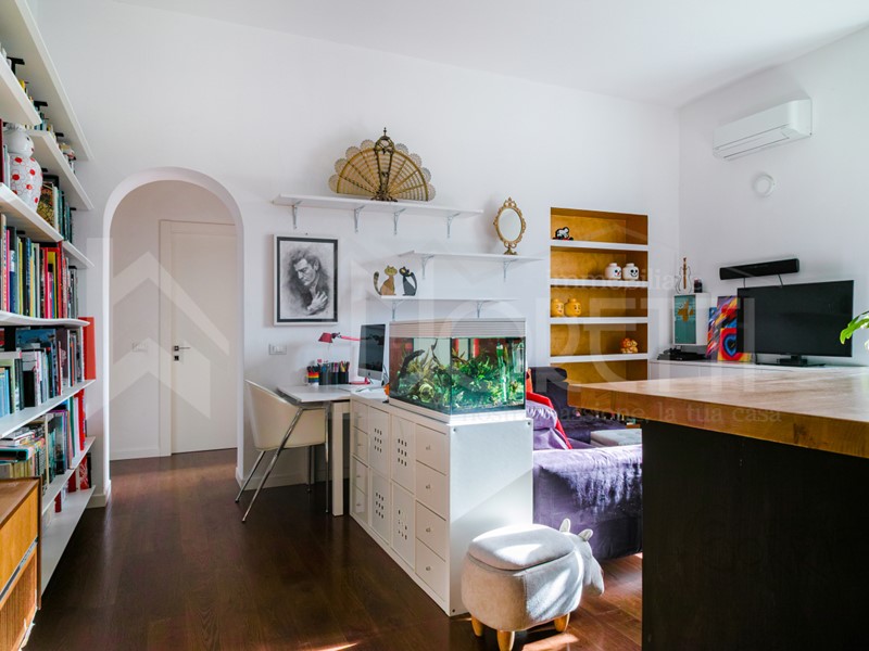 L’appartamento, affacciato sui giardini interni con alberi secolari e splendida vista su una rigogliosa magnolia, gode di grande luminosità e di un’atmosfera riservata e suggestiva. Gli ambienti sono impreziositi da un caldo parquet che dona continuità e armonia agli spazi.