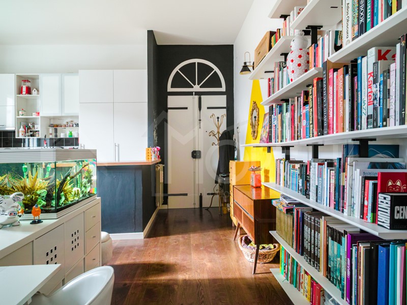 L’accogliente ingresso, dipinto con una piacevole pittura lavagna, conduce all’ampio soggiorno open space di oltre 30 mq, finemente curato in ogni dettaglio. Il portone originale dei primi del ’900, sapientemente restaurato, introduce a un ambiente caratterizzato da un raffinato contrasto bianco/nero che si integra perfettamente con la zona cottura, impreziosita da piastrelle Fornasetti.