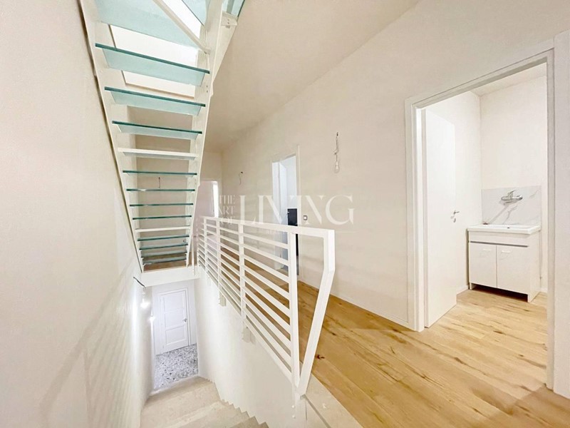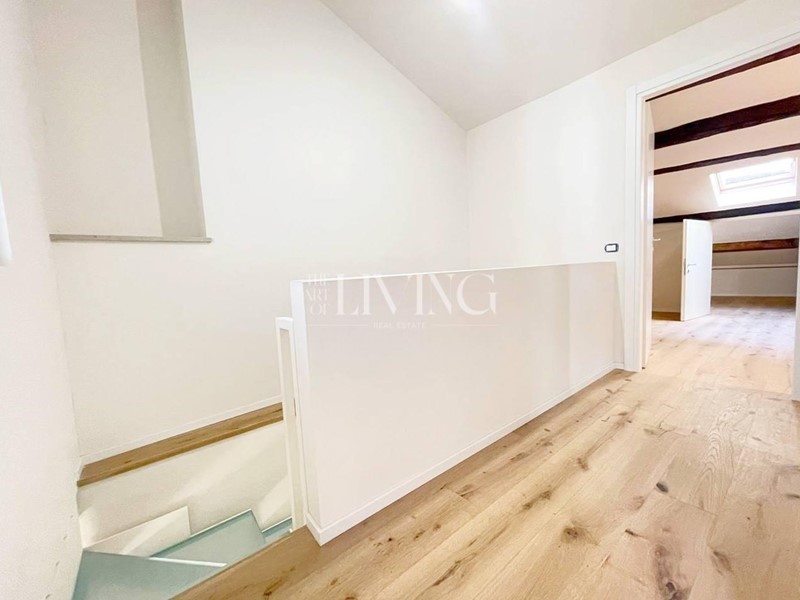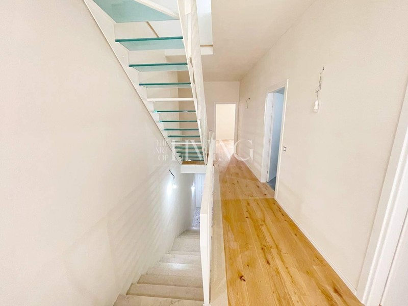 La scenografica scala in cristallo e acciaio conduce al secondo piano, dove si sviluppa la zona notte con un ulteriore bagno, due vani versatili ideali come camere, studio o area relax, oltre a una comoda soffitta.