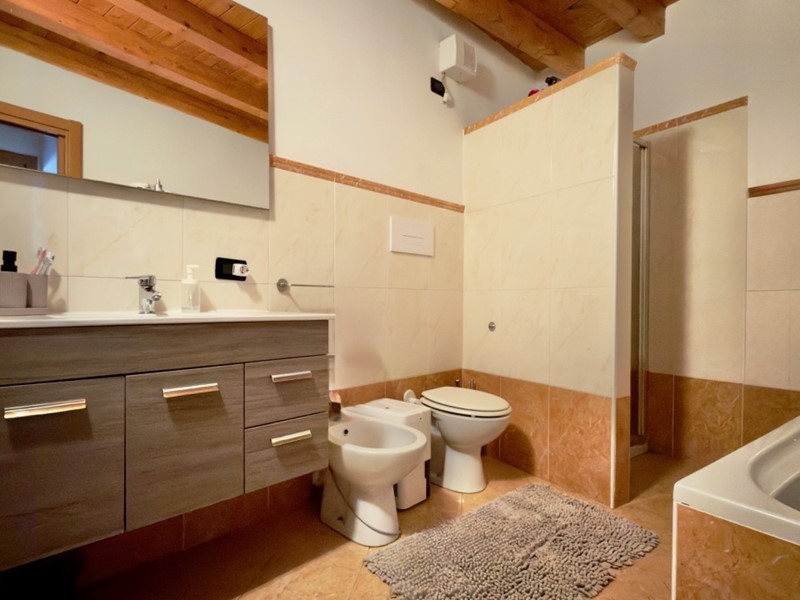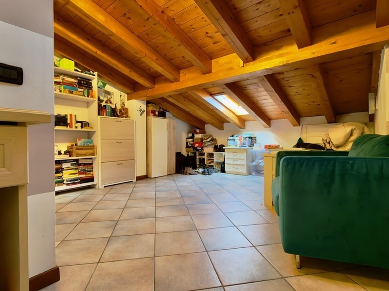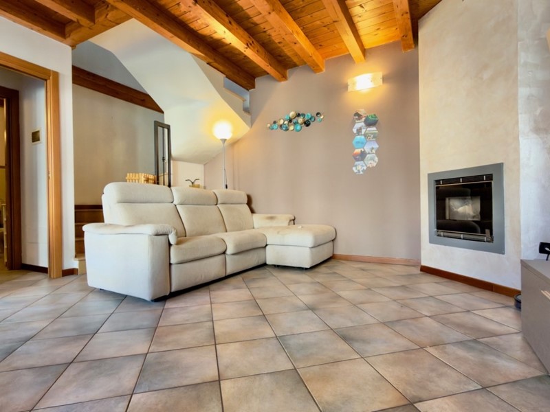 Appena si entra, si viene accolti dalla zona giorno con un grazioso caminetto a pellet; il cucinotto è semi-separato ed al piano abbiamo anche il bagno principale.