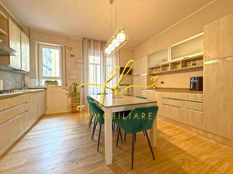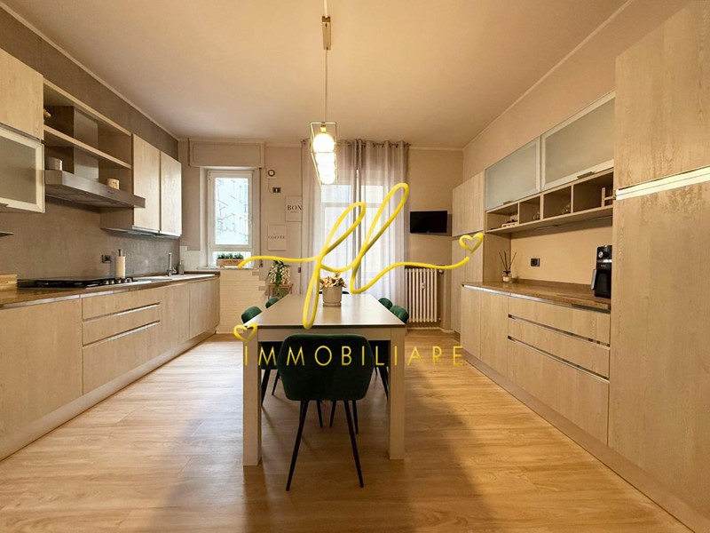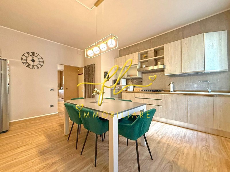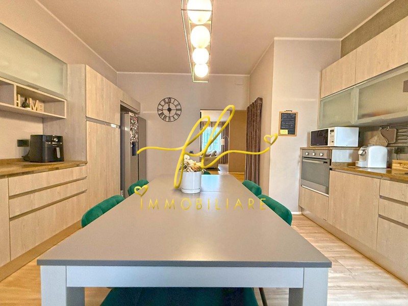 La cucina abitabile, a vista ma ben definita, è funzionale ed elegante, dotata di comodo ripostiglio e veranda ad uso lavanderia.