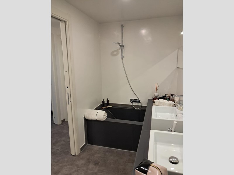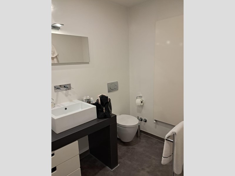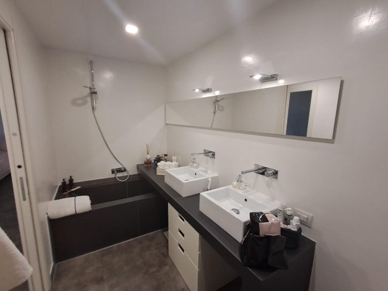 • Bagno con sanitari sospesi e due lavabi e termoarredo