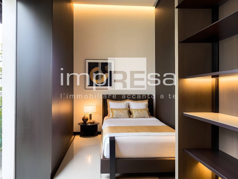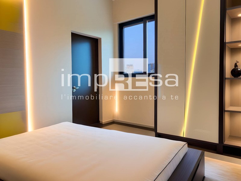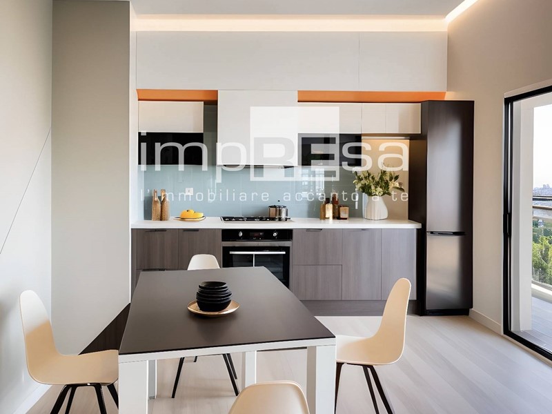 Entrando nellappartamento, ci troviamo subito nella zona giorno, un open-space che include il soggiorno, la sala da pranzo e la cucina, dotata di riscaldamento a pavimento ed impianto di raffrescamento.