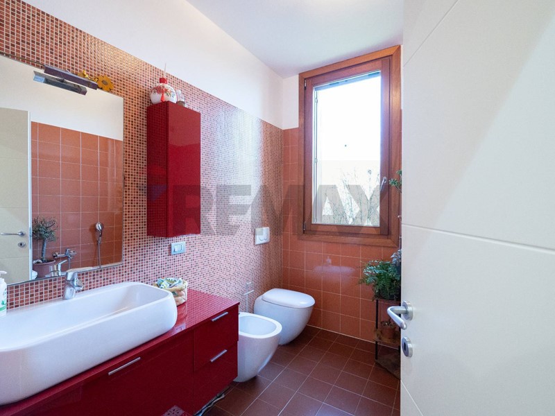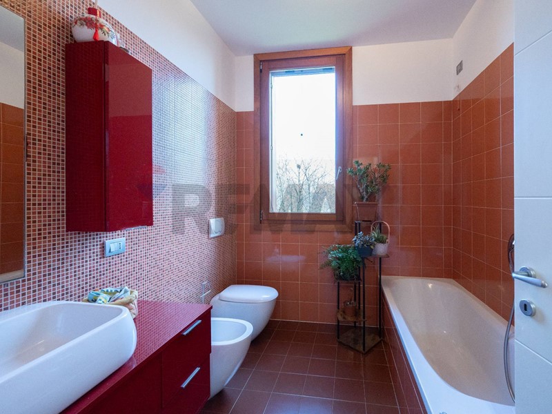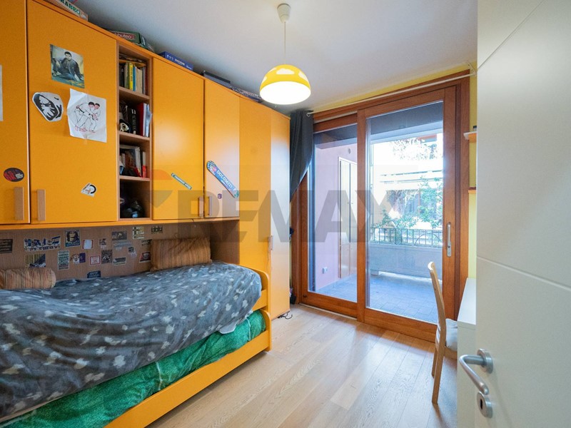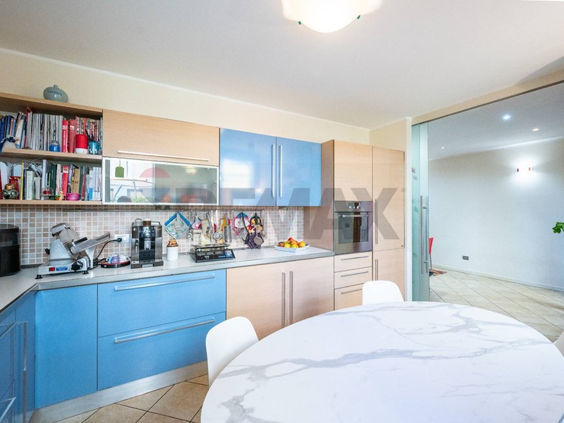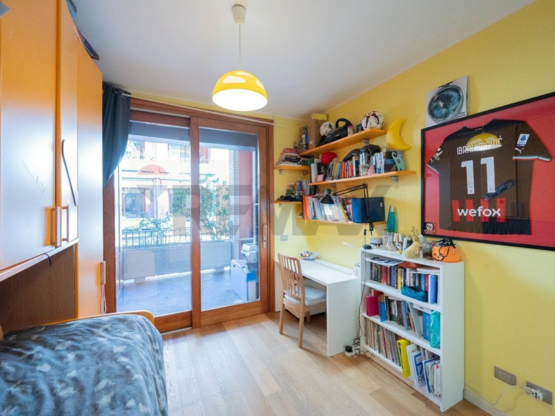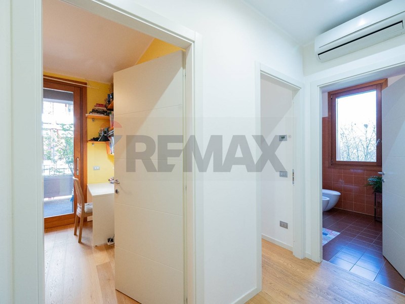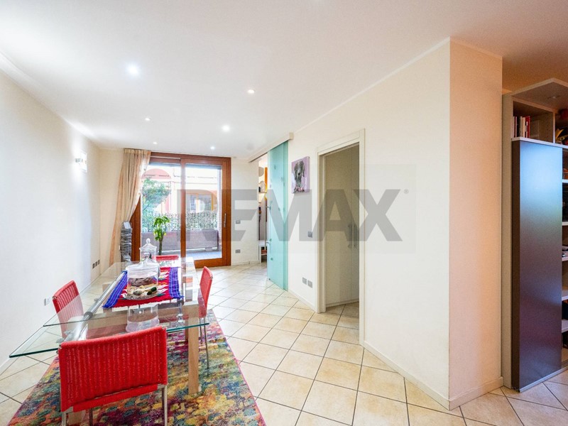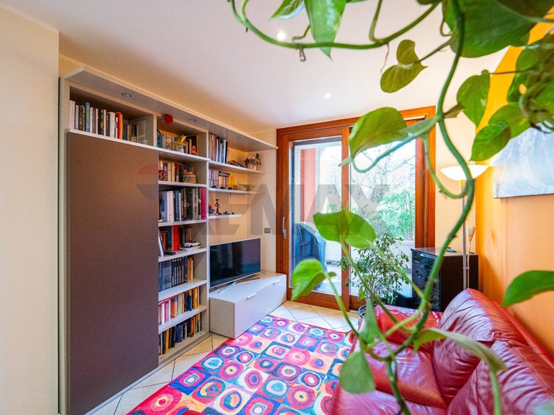 Ingresso accogliente, cucina abitabile luminosa con doppia finestra, separata dal soggiorno tramite unelegante porta scorrevole in vetro decorato; antibagno e bagno di servizio. La zona living comprende sala da pranzo e soggiorno, entrambe con porte finestre scorrevoli che affacciano sul giardino privato con vista sul parco, creando una perfetta continuità tra interno ed esterno in un atmosfera di relax anche visivo