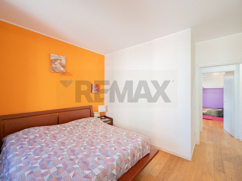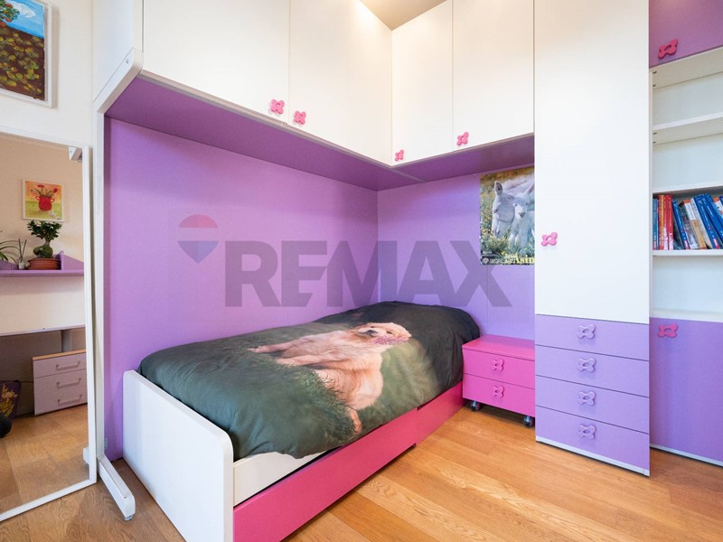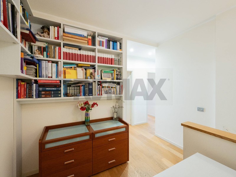 Si accede tramite una comoda e raffinata scala interna in ferro battuto laccato bianco con gradini in legno, elemento architettonico di design sobrio ed elegante. Il piano ospita un disimpegno con angolo studio, piccolo corridoio, bagno e tre camere da letto, di cui due dotate di ampie porte finestre scorrevoli con accesso a due ampie logge.