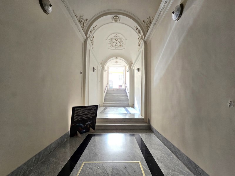 L'ingresso principale dell'edificio si apre su un ampio e raffinato androne, impreziosito da una maestosa scalinata in marmo, che conduce al piano dell'appartamento.