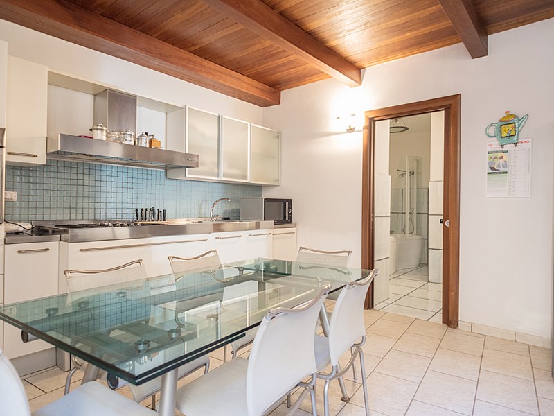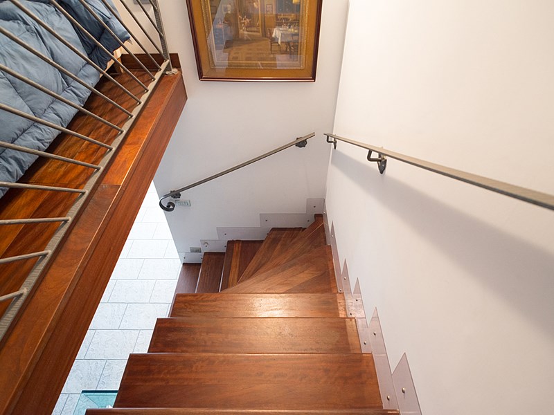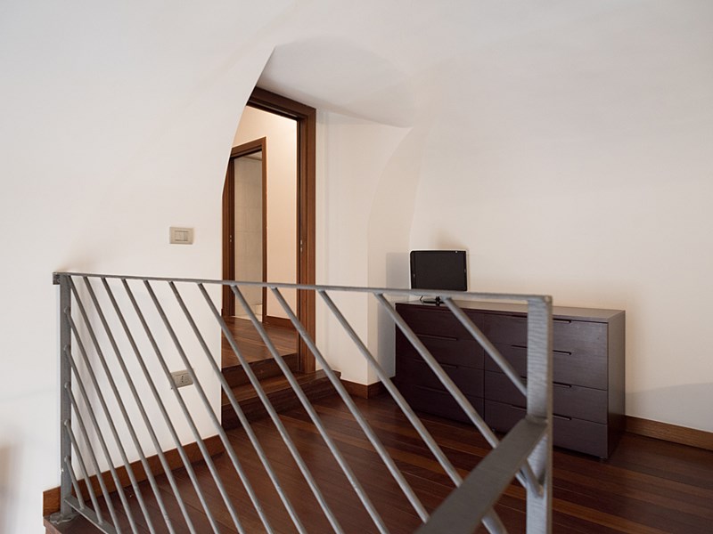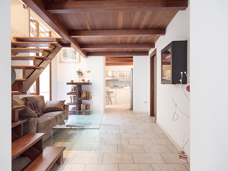 L’appartamento ti accoglie con un salone ampio e alto oltre 5 metri, collegato a un soggiorno con travi a vista e una scala in legno e ferro battuto che porta alla zona notte. La cucina-tinello è adiacente al soggiorno. Al primo livello trovi anche un bagno con vasca e un ampio guardaroba.