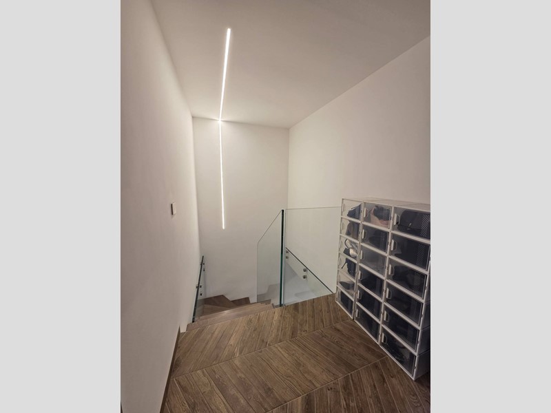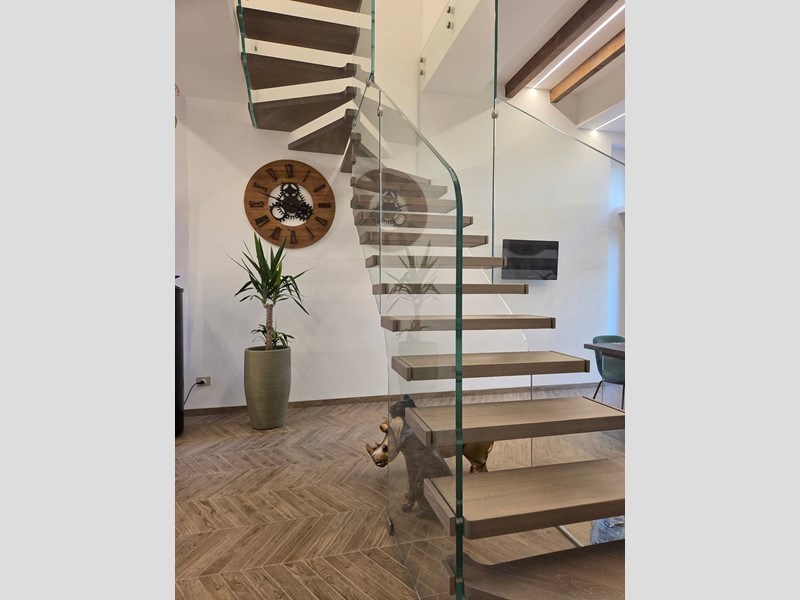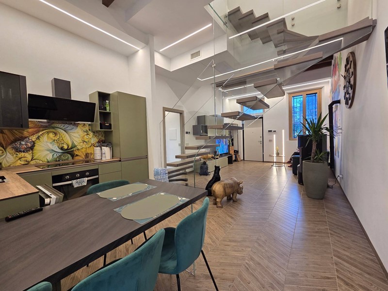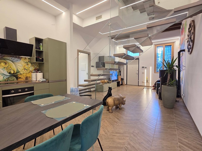 P.T. ingresso su ampio salone con cucina a vista, dominato da una scala di design in cristallo e legno, ampie vetrate e accesso diretto al giardino retrostante, lavanderia, ripostiglio e bagno.