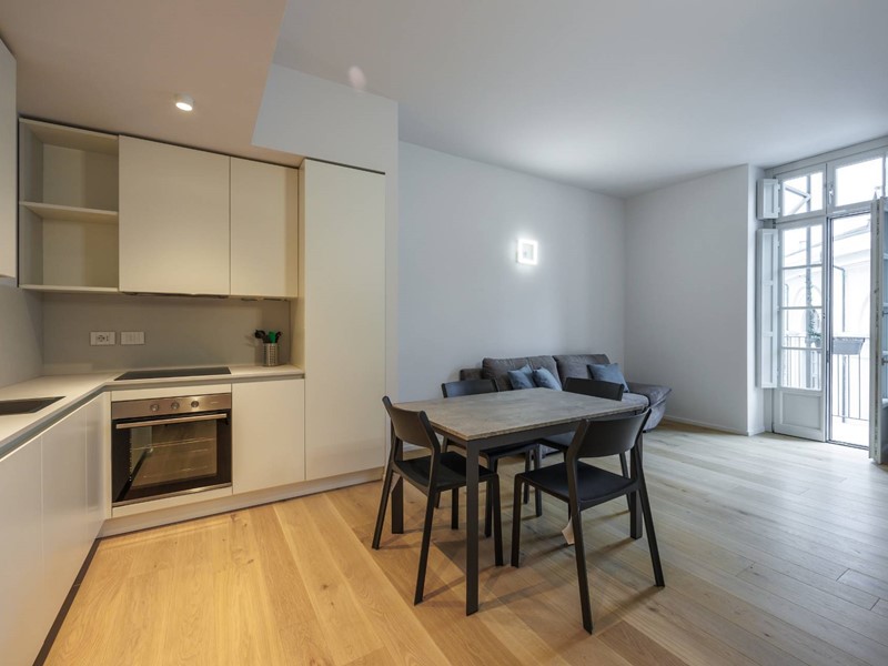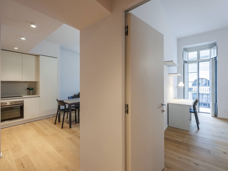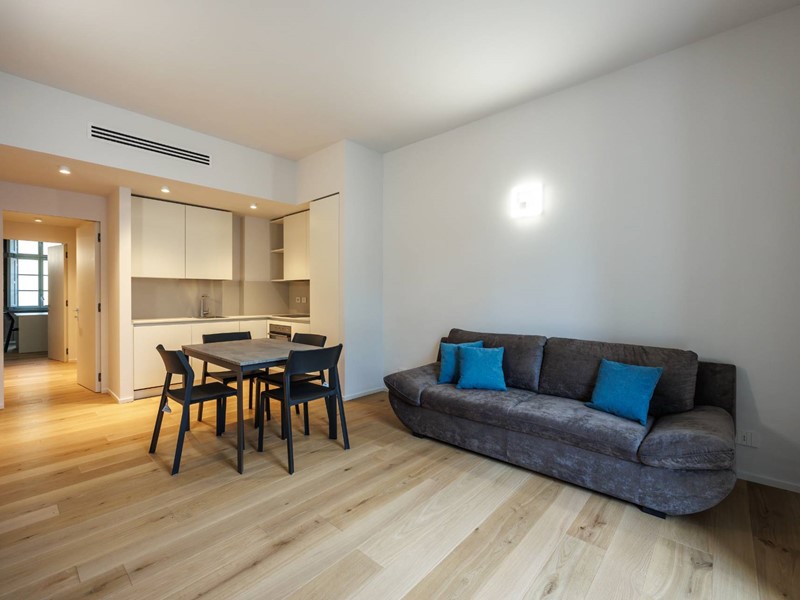Situato al terzo piano, l'appartamento viene affittato completamente arredato ed è composto da un ingresso su disimpegno, zona giorno con cucina a vista arredata con elettrodomestici, due camere da letto e due bagni. Balcone con affaccio sull'interno cortile.