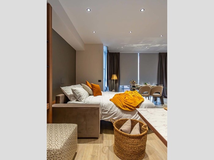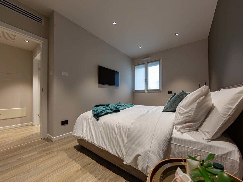 La zona notte, affacciata sul silenzioso cortile interno, è progettata per offrire massimo comfort e privacy, completata da un bagno finemente arredato.