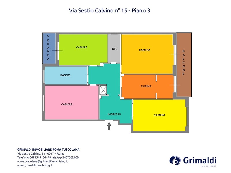 L'immobile è composto interamente da: ampio ingresso, soggiorno, tre camere da letto, servizio, ripostiglio, comodo balcone e veranda.