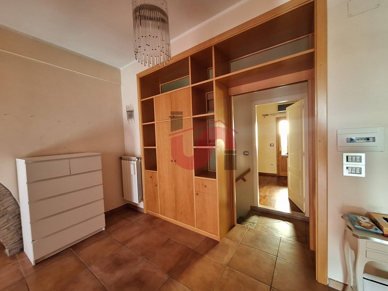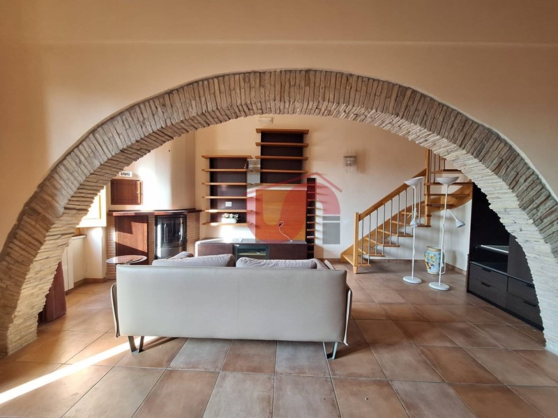 Lingresso si apre direttamente su unampia e luminosa zona giorno, caratterizzata da un suggestivo arco in mattoncini a vista e da un accogliente camino; questo ambiente, estremamente luminoso grazie all'affaccio su un balcone ottimamente esposto, comunica con una cucina abitabile con affaccio sullo stesso balcone. A servizio della zona giorno troviamo inoltre un pratico ripostiglio attrezzato a lavanderia, una camera adibita a studio con terrazzino privato che offre un angolo di assoluta riservatezza per il lavoro o il relax e il bagno padronale. Un disimpegno ben organizzato conduce infine alla zona notte dove si sviluppa la camera matrimoniale.