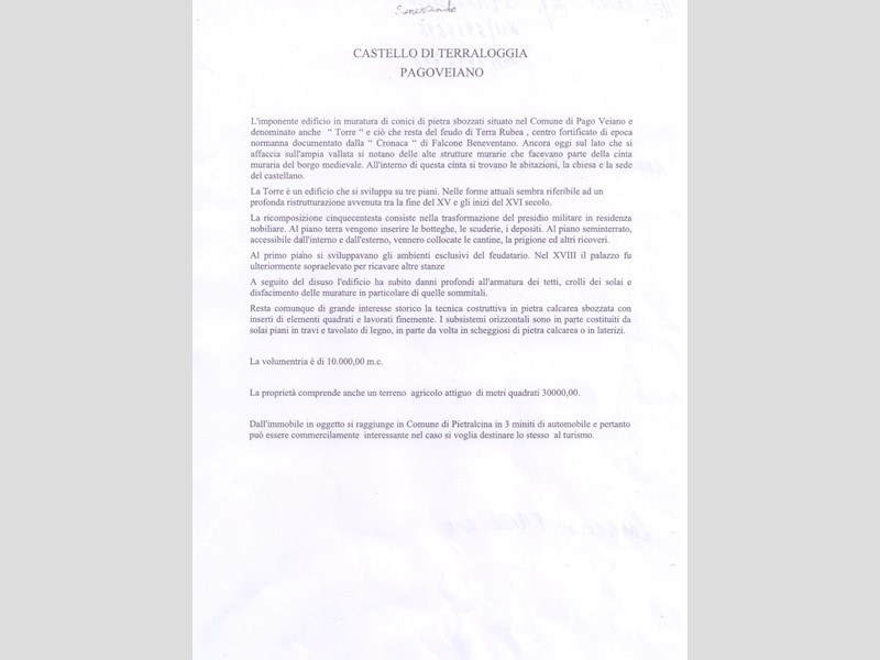 Proponiamo in vendita intero BORGO di antichissima provenienza avente grande valore storico, noto con il nome di "Castello di Terraloggia", situato nelle colline a ridosso del Santuario di Padre Pio, in territorio di Pago Veiano - Benevento.