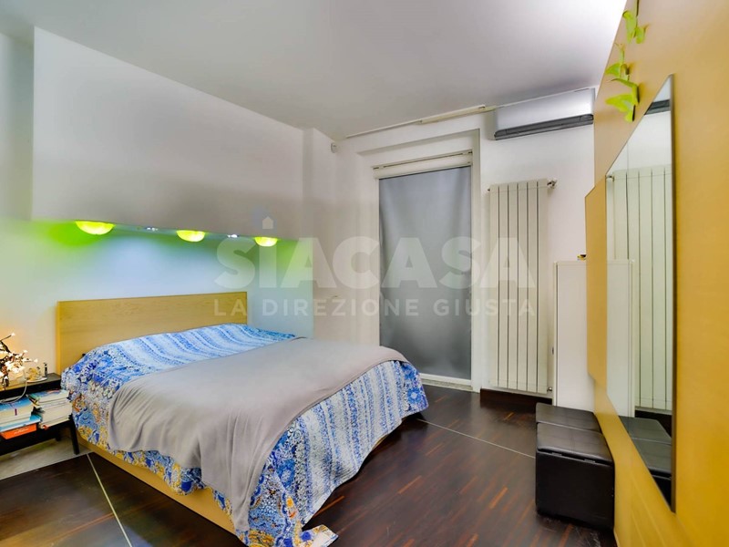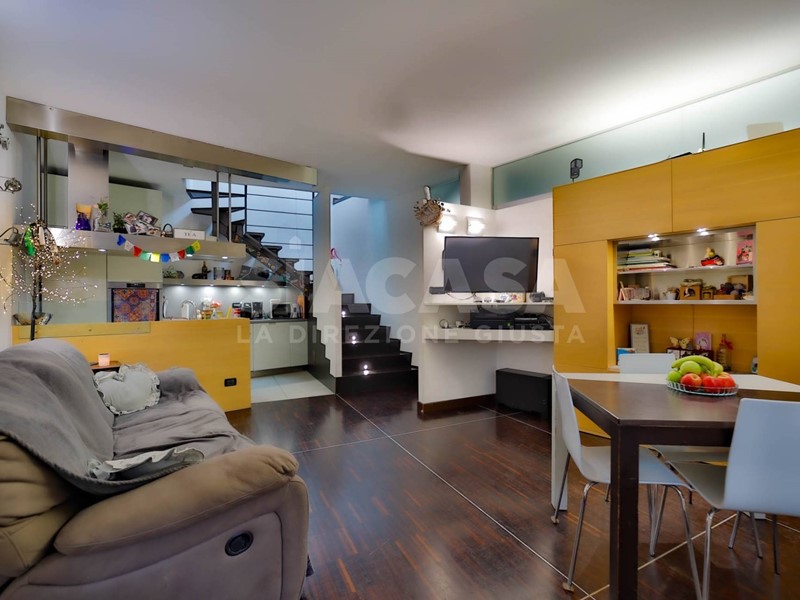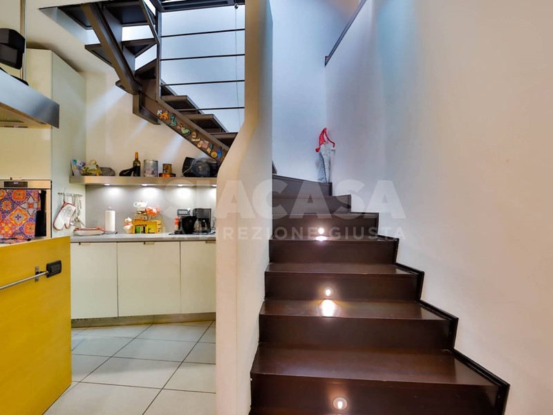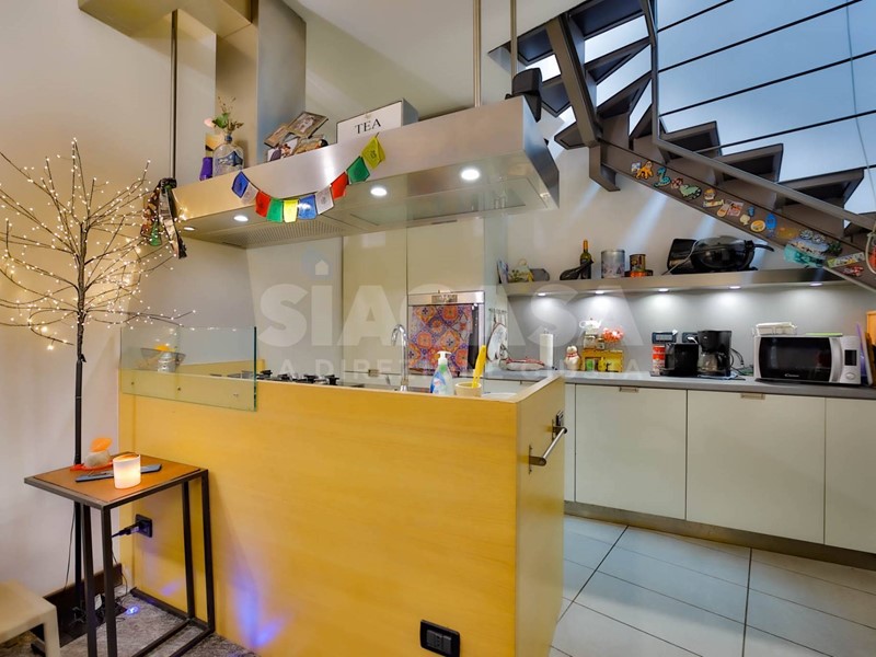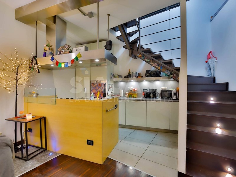 Al piano terra si apre un ampio soggiorno con cucina a vista, uno spazio conviviale e scenografico valorizzato da una scala a vista di design che conduce al piano mansardato e diventa elemento architettonico distintivo della zona giorno. Gli arredi sono completamente su misura e dialogano con finiture ricercate e pavimentazione in parquet che dona continuità ed eleganza agli ambienti.