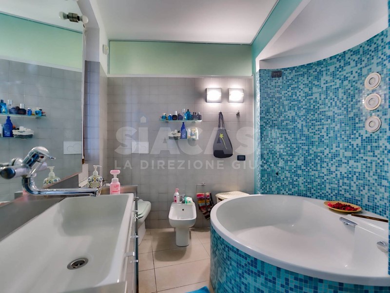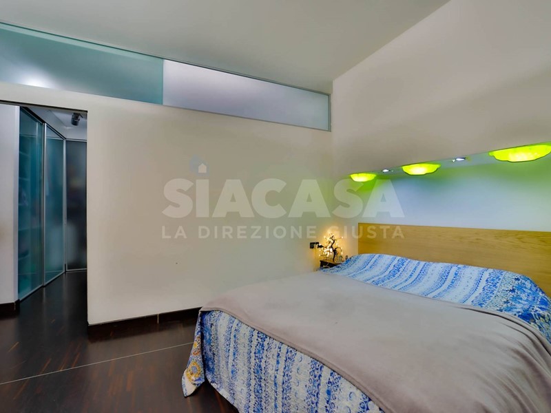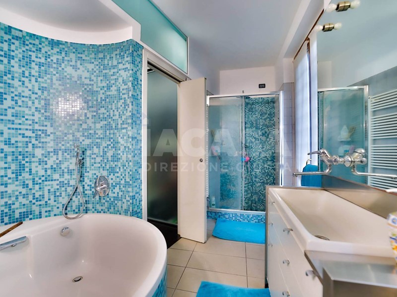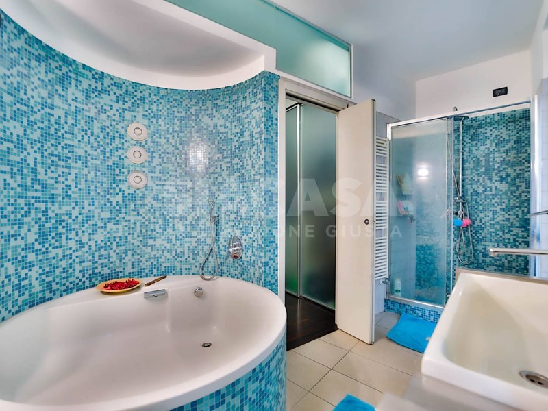 Sempre al piano terra troviamo una camera e un magnifico bagno padronale, concepito come una piccola area wellness privata, completo sia di doccia walk-in sia di suggestiva vasca rotonda.