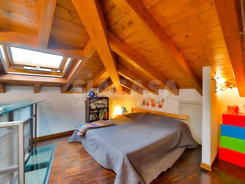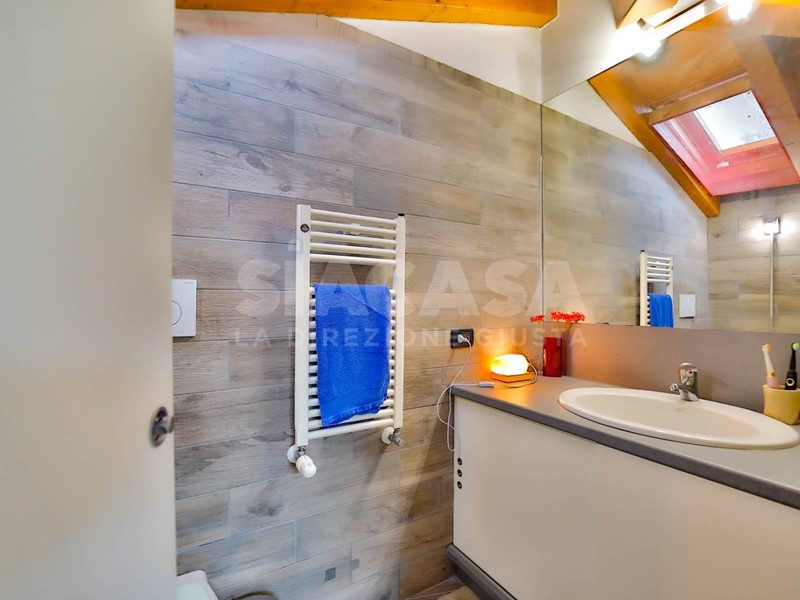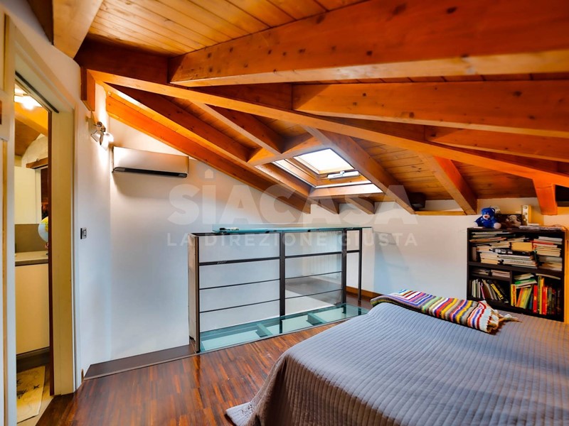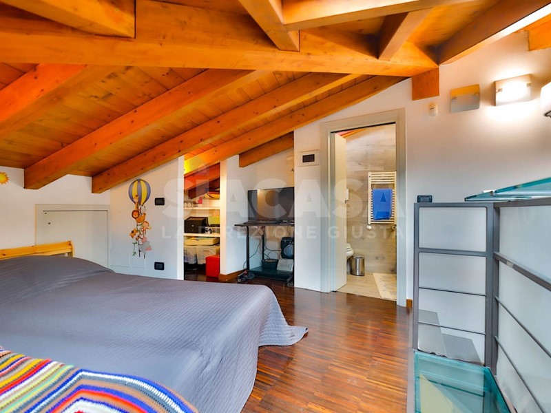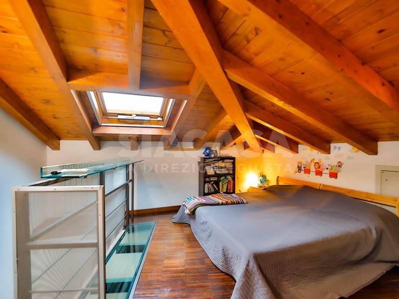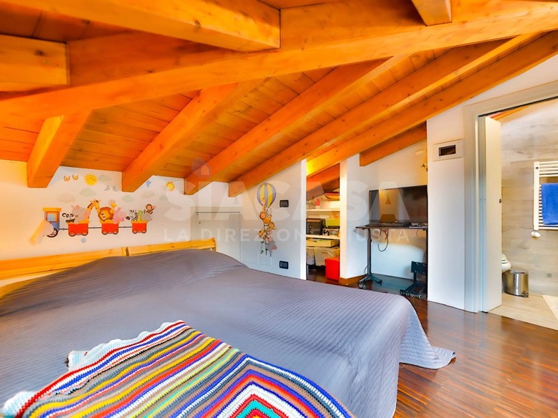 Salendo al primo piano mansardato, caratterizzato dalle travi a vista, troviamo un ampio locale adibito a camera da letto con ulteriore bagno. Latmosfera qui si fa ancora più intima e accogliente, mantenendo coerenza stilistica e qualità nelle finiture.