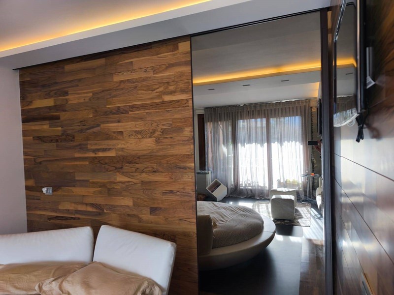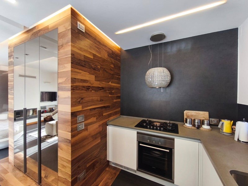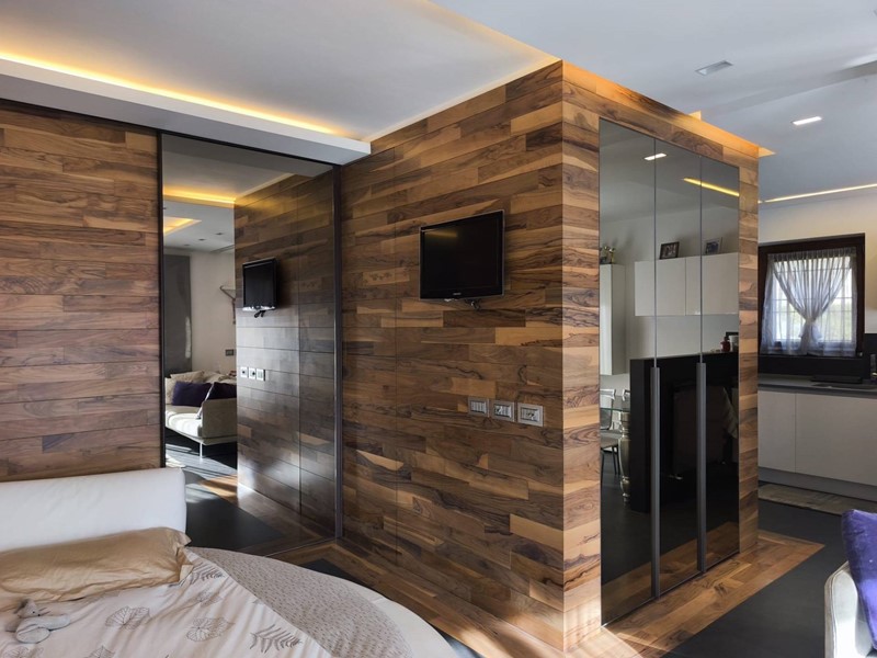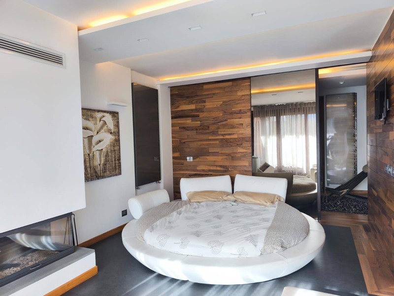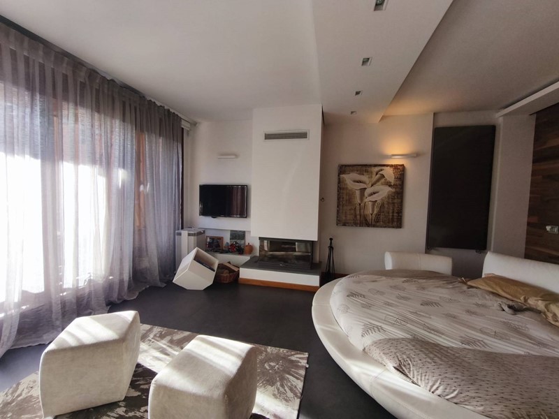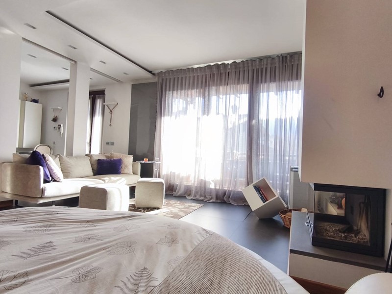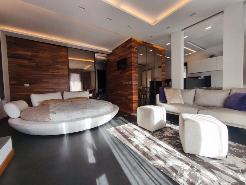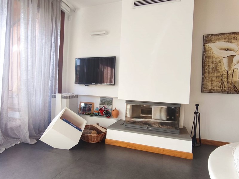 Labitazione si sviluppa in un elegante open space dove cucina a vista, zona living con camino e area notte si integrano armoniosamente, creando un ambiente caldo, accogliente e funzionale.