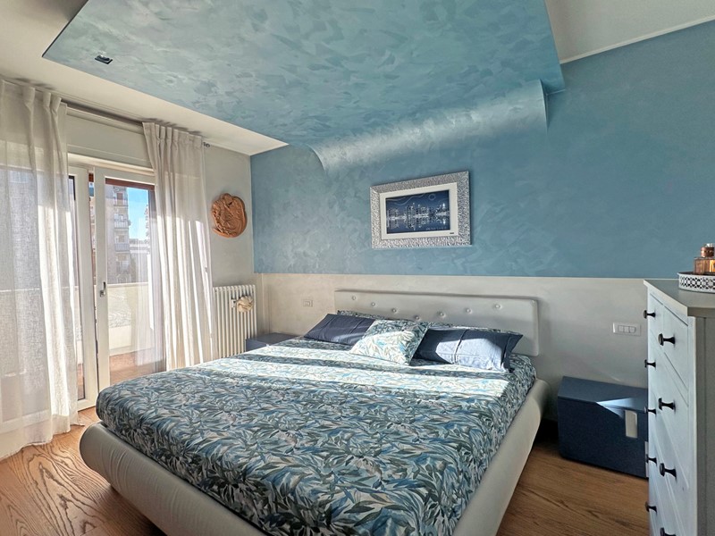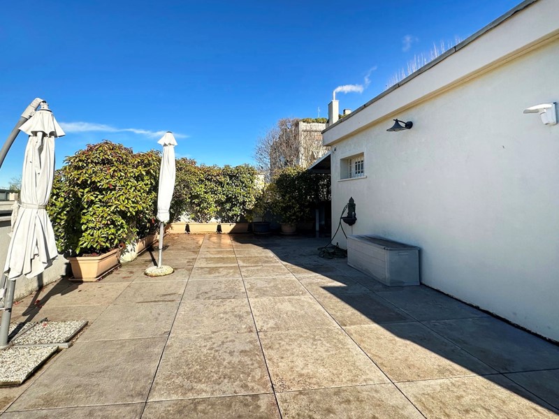 L'ingresso si apre sull'ampia zona soggiorno di circa 35 mq, straordinariamente luminosa grazie alle due porte finestre che conducono al primo balcone con affaccio interno sul verde condominiale. La zona notte del piano si sviluppa in modo armonioso: troviamo una prima camera comoda e luminosa con accesso diretto al secondo terrazzo angolare, due ulteriori camere da letto spaziose, tra cui la matrimoniale con uscita sul terrazzo, e due servizi entrambi finestrati, elegantemente rifiniti. La doppia esposizione opposta garantisce ambienti ariosi, luminosi e piacevolmente vivibili in ogni momento della giornata.