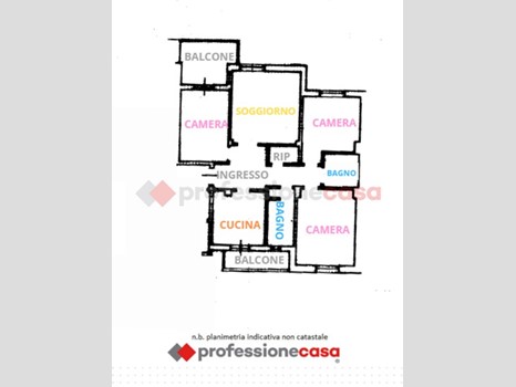 L'appartamento è composto da ingresso, soggiorno, tre camere da letto, cucina, due balconi e due bagni.