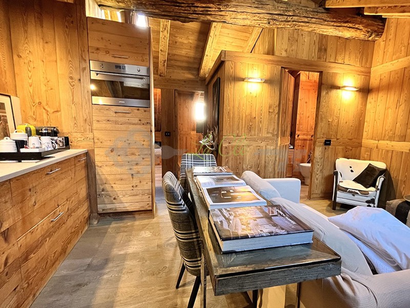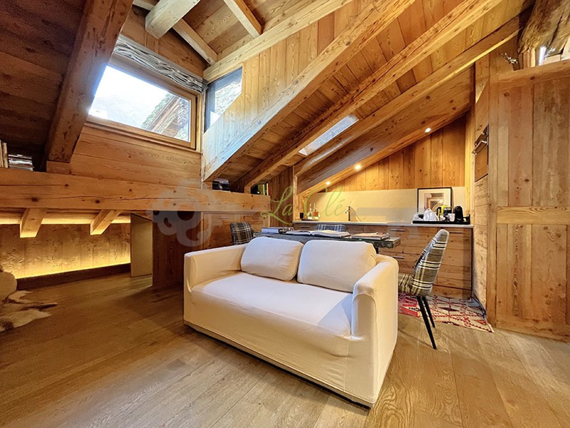 VENDITA COURMAYEUR - UN GIOIELLINO IN CENTRO, A BREVE DISTANZA DALLA PARTENZA DELLA FUNIVIA, NONCHE DAI SERVIZI, DAI RISTORANTI E DALLE BOUTIQUE DI VIA ROMA. Splendida mansarda, finemente ristrutturata e VENDUTA COMPLETAMENTE ARREDATA, caratterizzata da finiture di pregio, in BOISERIE in legno vecchio, mobili su misura, con vista e posizione eccezionale.