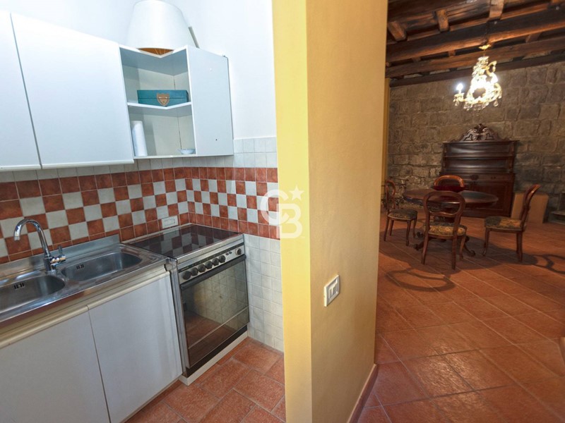 Varcando il portone di ingresso si viene accolti da unatmosfera calda e autentica, la proprietà conserva infatti intatto il fascino delle abitazioni storiche viterbesi, un ambiente intimo e suggestivo, impreziosito da un arco in pietra e da un camino, soffitti con travi a vista, pavimenti in cotto e pareti in pietra naturale, e una grande vetrata apribile, che creano un equilibrio perfetto tra fascino storico e comfort contemporaneo, completano il livello un pratico angolo cottura e un bagno con vasca, che rendono questo spazio autonomo e funzionale rispetto al resto della proprietà.