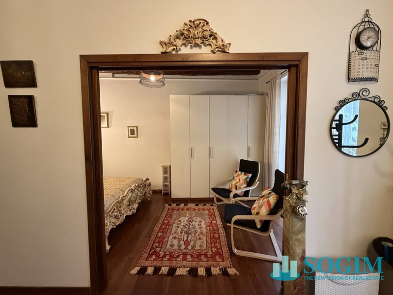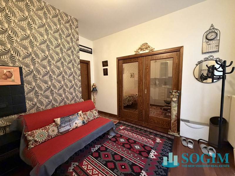 La soluzione è dotata sia di porte scorrevoli sia a battente, doppi vetri in legno bianco con persiane, caldaia autonoma e termosifoni in ghisa. La tipologia di pavimentazione varia a seconda degli ambienti: dal parquet con tonalità scure in soggiorno e camera alla ceramica in bagno.