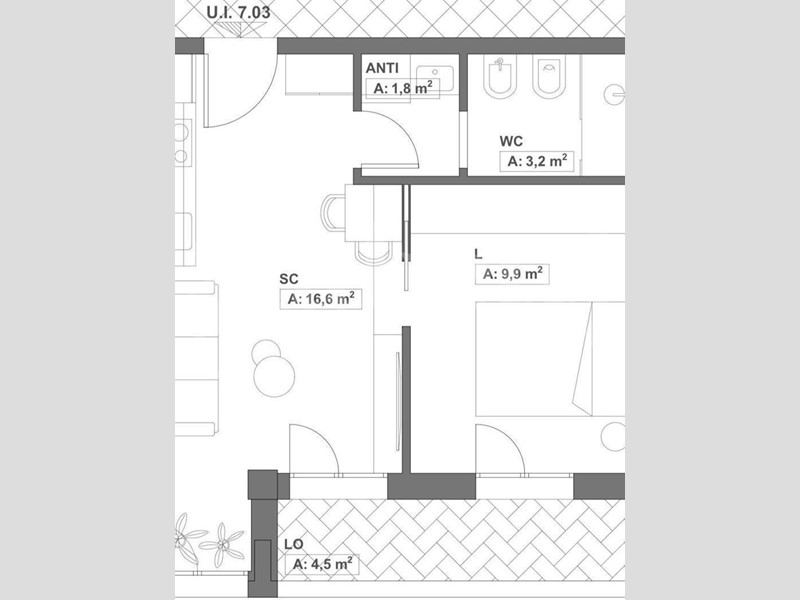 UNITA' 3 accogliente bilocale composto da ingresso su luminoso salotto con angolo cottura, terrazzo 4,5 mq camera matrimoniale e bagno con antibagno.