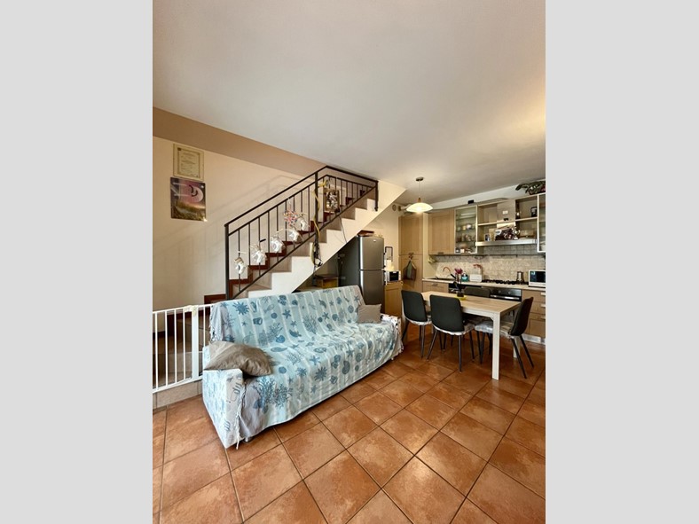 L'appartamento, all'interno di un complesso di sole nove unità di recente costruzione, è così strutturato: al primo piano ingresso, bagno con doccia e zona lavanderia, soggiorno con cucina a vista ed affaccio su balcone panoramico; al secondo piano disimpegno, due locali adibiti a camera matrimoniale e cameretta e secondo bagno con vasca.