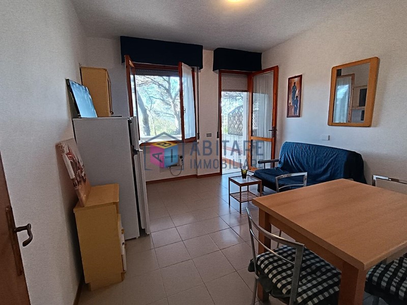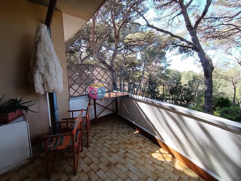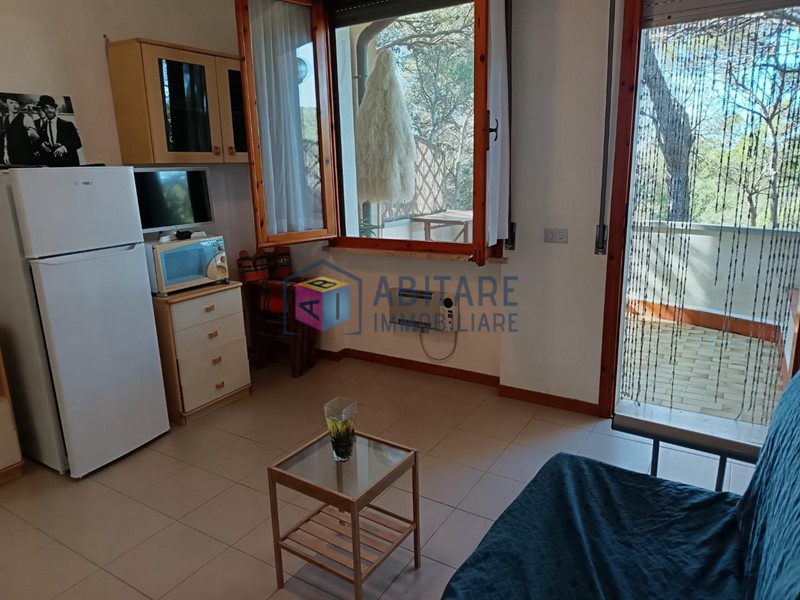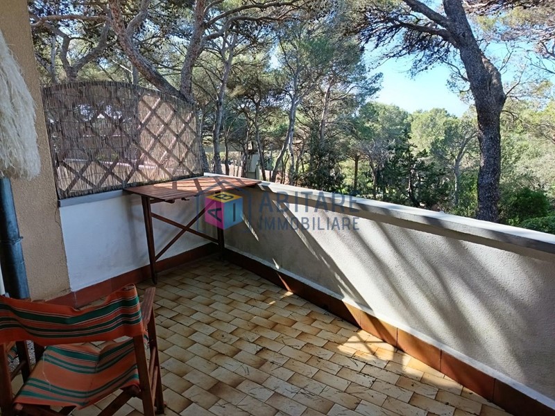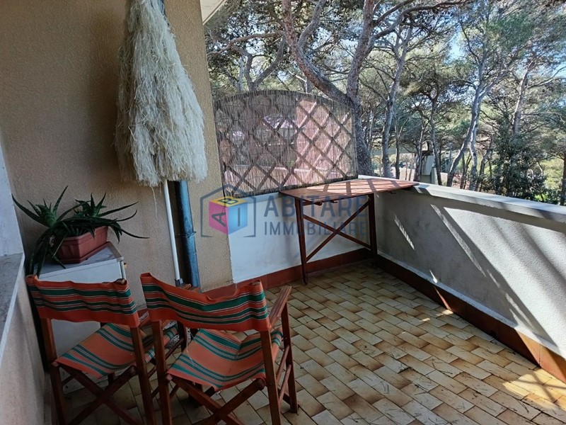L’appartamento è composto da ingresso luminoso con cucinotto e ripostiglio a scomparsa, soggiorno con divano letto e zona pranzo, terrazza ampia e riservata con vista sulla pineta e scorcio di mare, camera matrimoniale con armadio e bagno con doccia a pavimento (senza finestra).