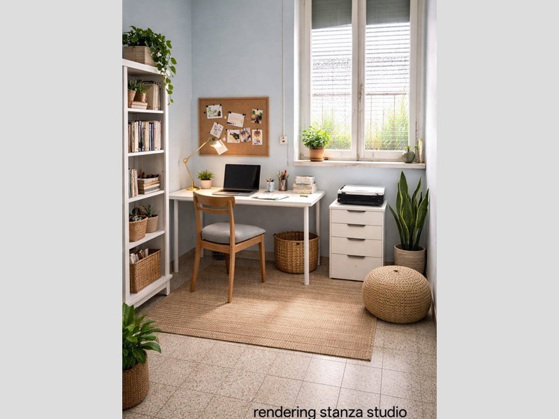Gli spazi sono generosi e ben distribuiti: la cucina, con il suo balconcino, è luminosa e raccolta; la sala, ampia e accogliente, si apre su un balcone che affaccia sul giardino interno e regala una vista piacevole; la zona notte offre una camera matrimoniale, una camera doppia e uno studio, ambienti che possono adattarsi alle esigenze di una famiglia o di chi desidera uno spazio dedicato al lavoro o alle proprie passioni.