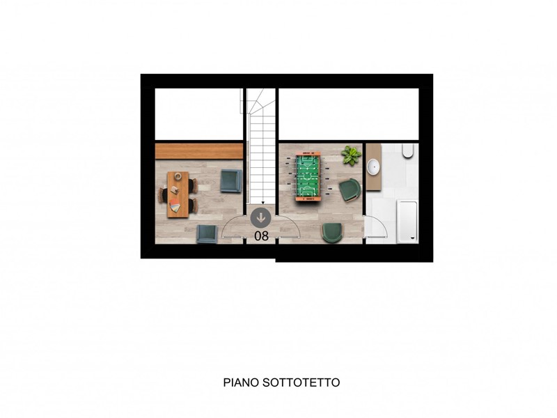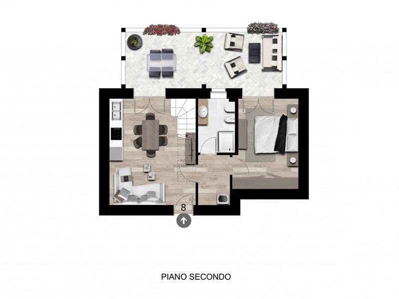 Al secondo piano lingresso si apre su un luminoso soggiorno con cucina a vista caratterizzata da accesso diretto al terrazzo. Sempre al piano principale troviamo una camera da letto matrimoniale e bagno finestrato.