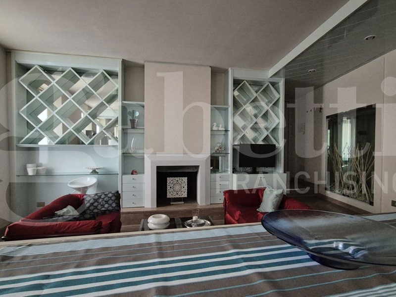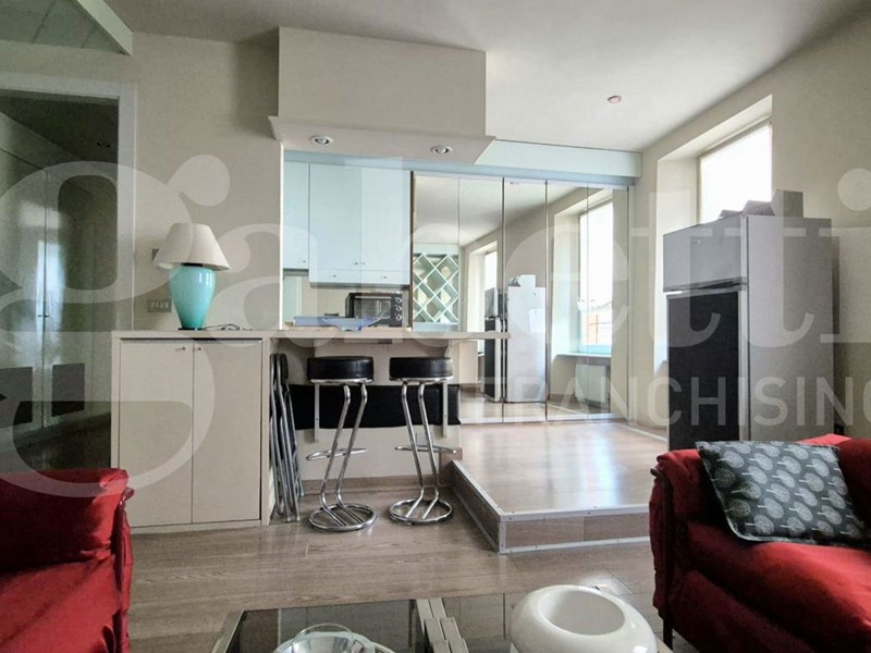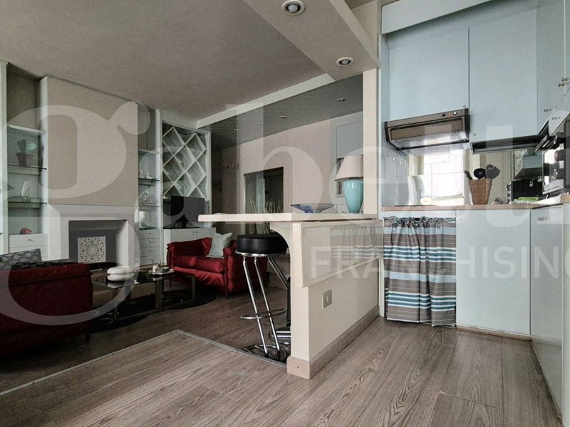 L'ingresso è direttamente nella zona living con cucina a vista completa di induzione, un piccolo disimpegno con armadiature a muro conduce poi alla camera da letto matrimoniale e al bagno, provvisto di box doccia.