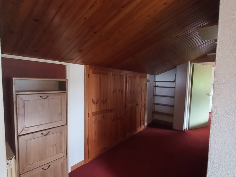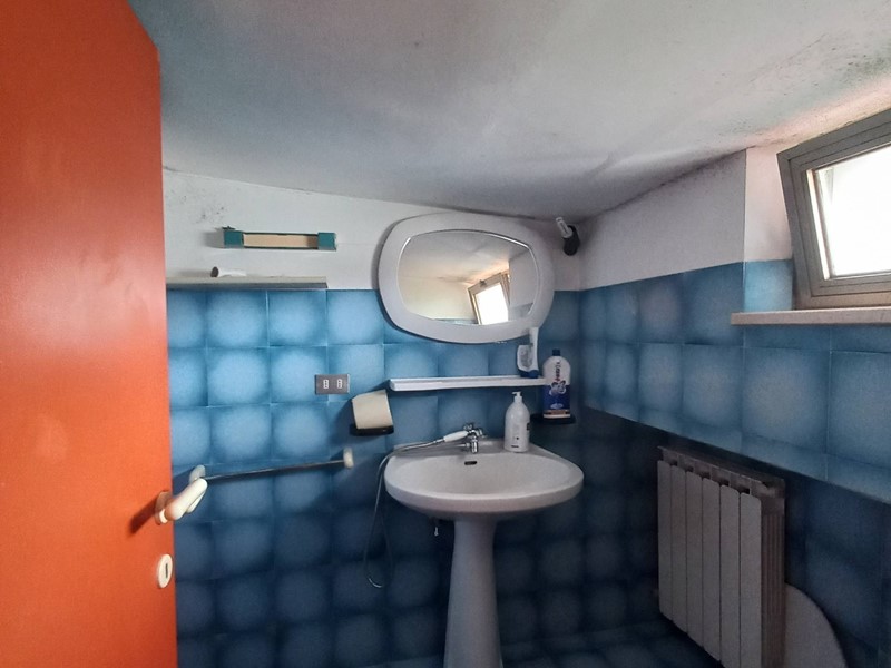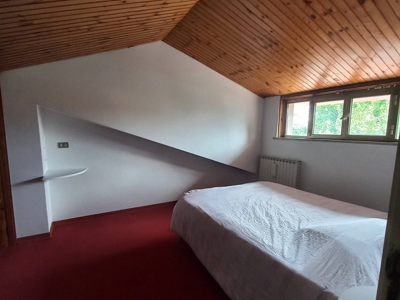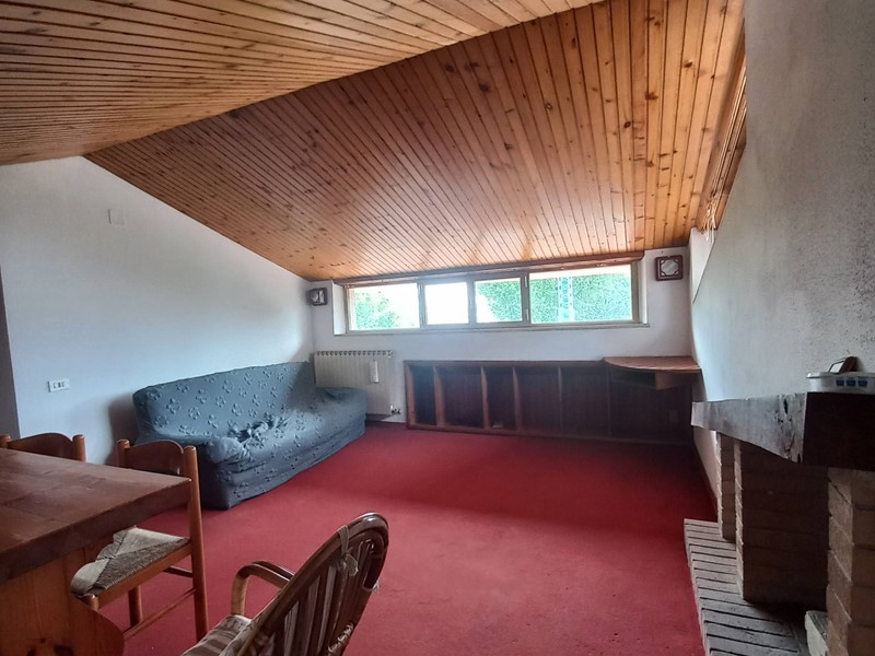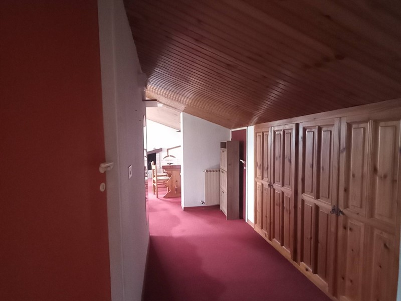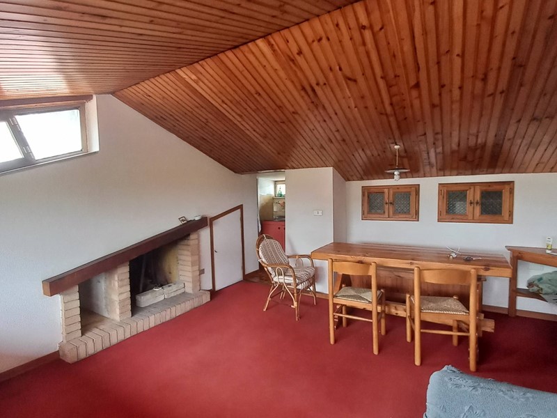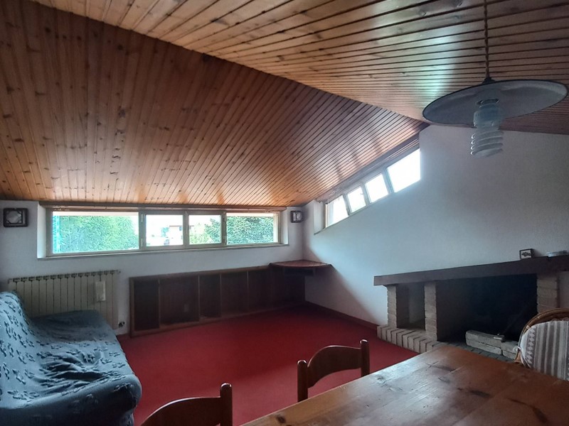 L'appartamento è composto da piano primo con una enorme zona giorno con salone e zona pranzo aperta, camino centrale, angolo cottura e balconi perimetrali, la zona notte è composta da quattro ampie camere da letto e due bagni finestrati, su questo piano i pavimenti sono in ceramica nella zona giorno e parquette nelle camere, gli infissi sono in alluminio con scorrevoli in pvc. Il secondo piano è composto da mansarda con il classico tetto spiovente rivestito in legno, pavimenti in moquette, camino nella zona giorno, tinello, bagno, camera matrimoniale e studio, a tutti gli effetti un piccolo appartamentino di 60 mq, più 122 mq di sottotetto.