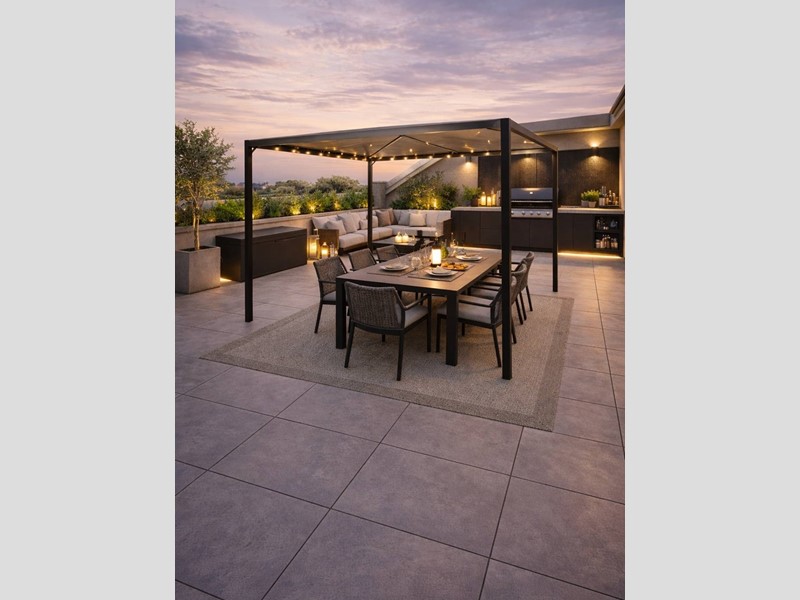 La cucina a vista si integra perfettamente nel design del living, che si estende naturalmente verso un primo terrazzo vivibile, ideale per colazioni all'aperto.
