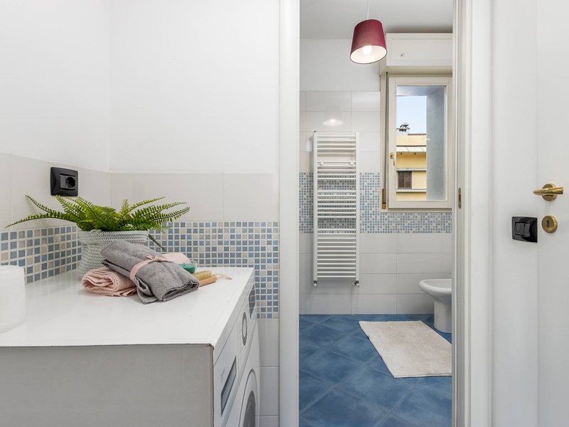 'Zona Giorno con bagno di servizio finestrato, doccia, disimpegno organizzato con attacchi per lavatrice e asciugatrice.