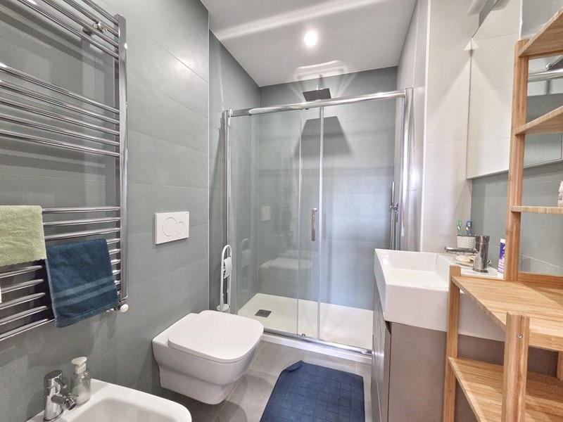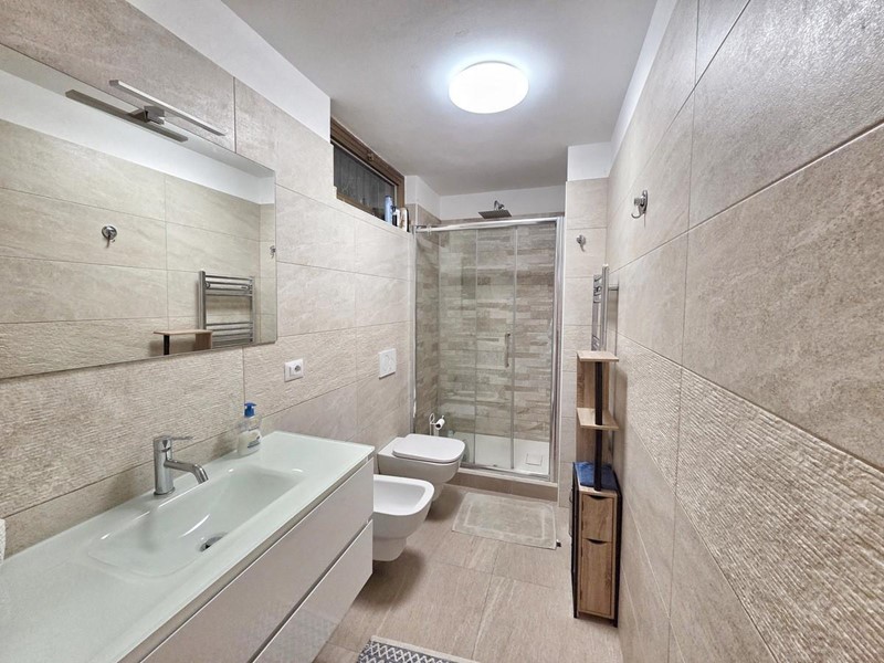- Piano Rialzato: Ingresso su accogliente soggiorno con cucina a vista, che si affaccia su un’ampia terrazza pranzabile. La zona notte comprende due camere matrimoniali, ciascuna servita da un bagno en suite con doccia.