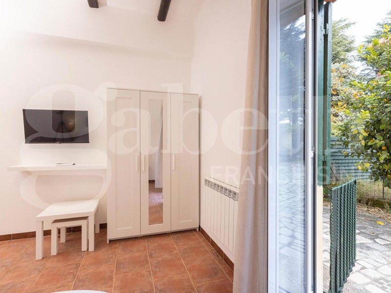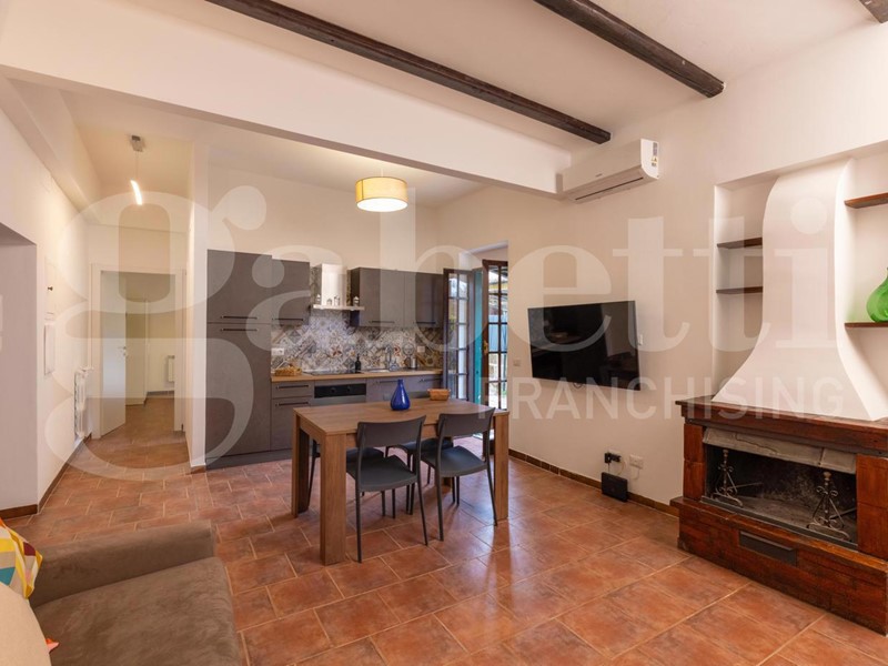 L'appartamento dispone di una camera da letto spaziosa, un bagno finestrato con box doccia, una cucina a vista completamente attrezzata e un luminoso soggiorno con camino.